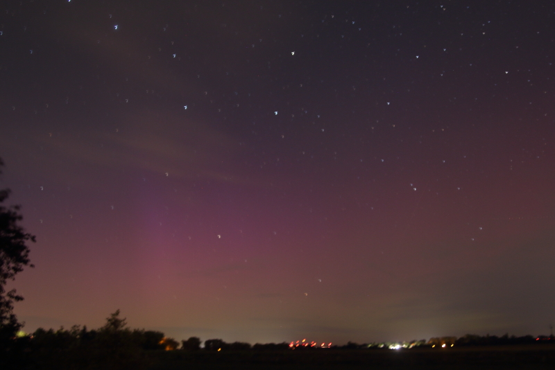Dort kam ich gegen 22:30 Uhr MESZ an und konnte rötlich violettes Polarlicht festhalten. Als Zugabe gab es immer wieder Richtung Norden Wetterleuchten von dem Gewitter bei Sylt/Rømø zu sehen. Leider war die kurze Aufklarphase sehr kurz daher beendete ich die Beobachtung wieder aufgrund aufziehender Wolken um 22:55 Uhr MESZ.