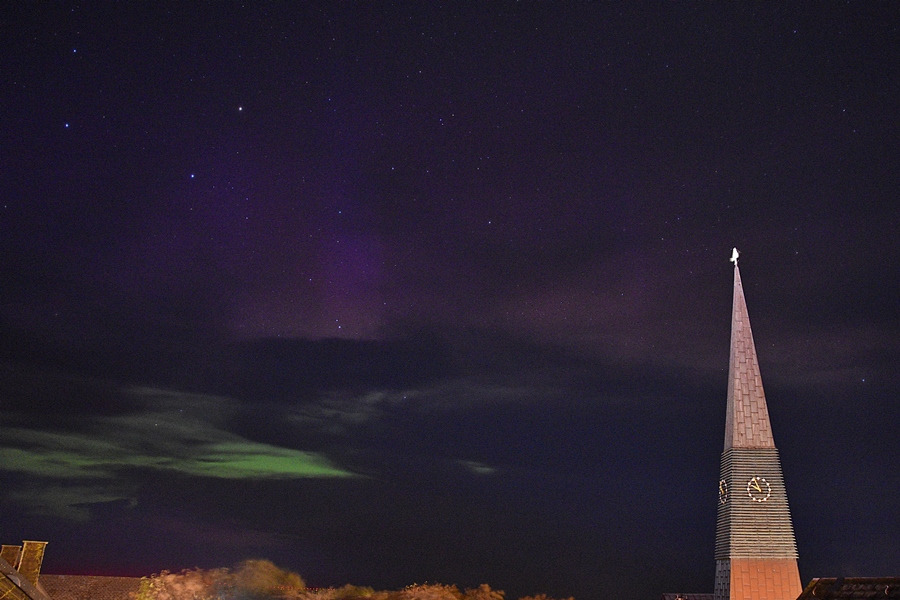 Hier bei Würzburg (50° Nord) haben sich die Wolken erst gegen Mitternacht verzogen. Ab 01:20 Uhr MESZ konnte ich dann den rötlich-violetten Himmel auf den Fotos erkennen (Canon EOS 6D mit Tamron 17-35mm bei 17mm, f 2.8, ISO3200, 25sec).