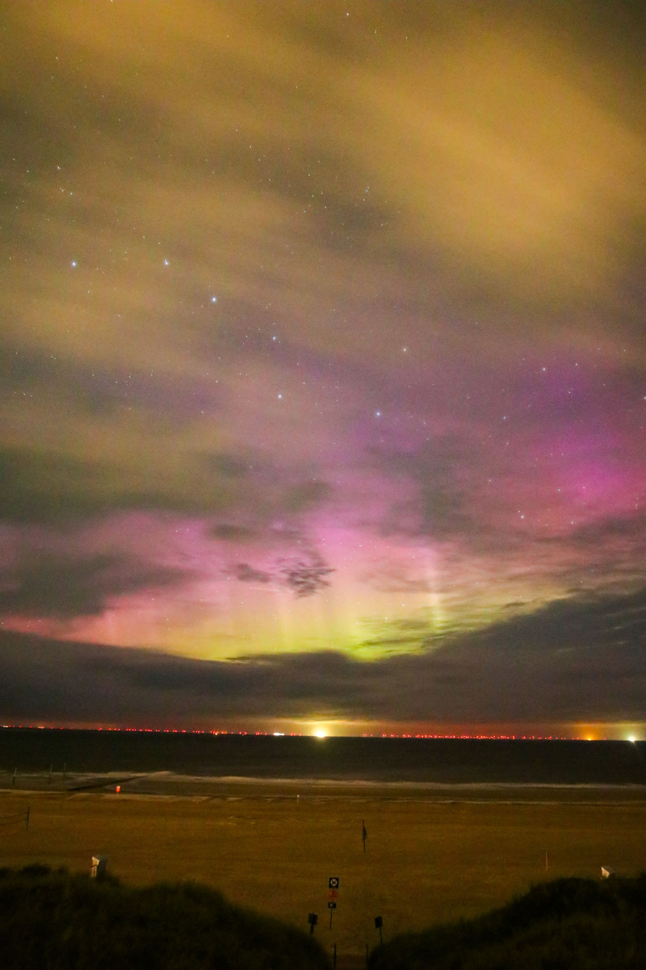 Zu Beginn gegen 21 Uhr schwaches Leuchten am Horizont, Intensität nahm innerhalb einer Stunde zu. Gegen 22:30 ein intensives Leuchten mit Beamern mit bloßem Auge gut zu erkennen. Ich meinte, sogar eine violette Färbung zu erkennen. Fotografisch waren violette Beamer mit blau auslaufenden Spitzen erkennbar.