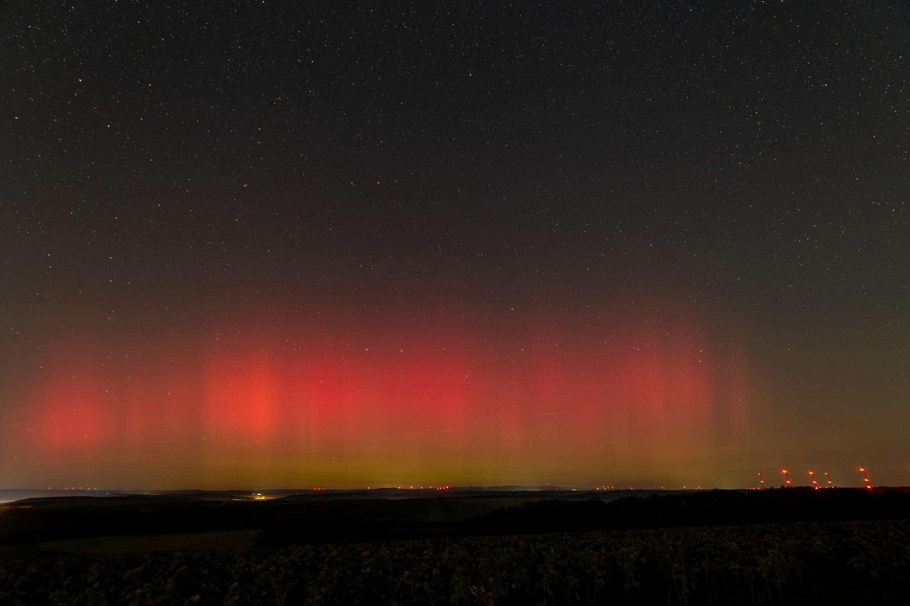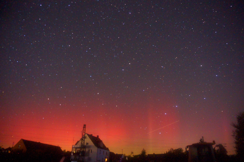 erst einmal allen Glückwunsch zu den tollen Sichtungen. Ich selbst war bereits gestern Abend gegen 23 Uhr raus, konnte dort aber aufgrund des Mondes und der städtischen Beleuchtung bisher nichts ausmachen. Erst kurz nach 0:45 konnte ich erstes rotes Glimmen am Nordhorizont fotografisch festhalten. Doch was dann gegen 1 Uhr passierte, hatte ich nicht mit gerechnet. Der Nordhimmel wurde plötzlich glutrot! Zu dem war auch noch ein grüner Bogen visuell sichtbar. Auf der Kamera zeigten sich sehr helle Beamer: Das Polarlicht wurde dann so hell, dass das Bild dann überbelichtet war: Nach herunterschrauben der Belichtung wurde dann eine knallrote Fläche mit darunter liegendem grünen Bogen sichtbar: Auch mit bloßem Auge war der Himmel nach wie vor rot. Das Polarlicht schwächte sich kurz nach 1 Uhr aber bereits wieder ab und konnte ab da an nur noch horizontnahes rotes Glimmen und einen grünen Bogen fotografisch festhalten. Dies änderte sich dann mit Beginn des zweiten Substurmes gegen 4 Uhr MESZ. Hier gab es dann deutlich visuelles Polarlicht mit grünem Bogen und roten Beamern, die Farben konnte ich ebenfalls wieder wahrnehmen: Später zeigte sich zu dem noch ein riesiger blauer Beamer: Dieser stieg gewaltig in den Himmel empor und lag sogar noch höher als der Polarstern, der zu dem Zeitpunkt etwa 51° über dem Horizont stand. Gegen 4:40 Uhr brach ich dann ab, zumal die städtische Beleuchtung wieder angeschaltet war und es auch zunehmend diesig wurde.