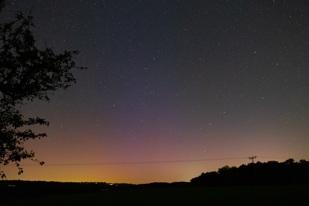 vergangene Nacht waren ja Polarlichtbeobachtungen bis weit unter 50 Grad Nord möglich. Dafür war das Polarlicht hier bei Würzburg deutlich visuell sichtbar und der Nordhimmel rötlich verfärbt. Obwohl ich bis 0:55 Uhr (MESZ) fasziniert den Monduntergang im Westen beobachtet habe, konnte ich den heller werdenden Nordhimmel erkennen.