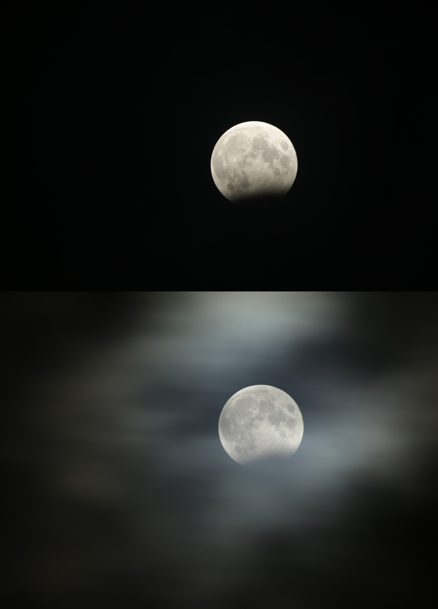 Ich hatte Glück mit den Wolken rechtseitig zum Mondfinsternis waren Wolkenlücken so dass Ich den Mondfinsternis fotografieren und sehen konnte.