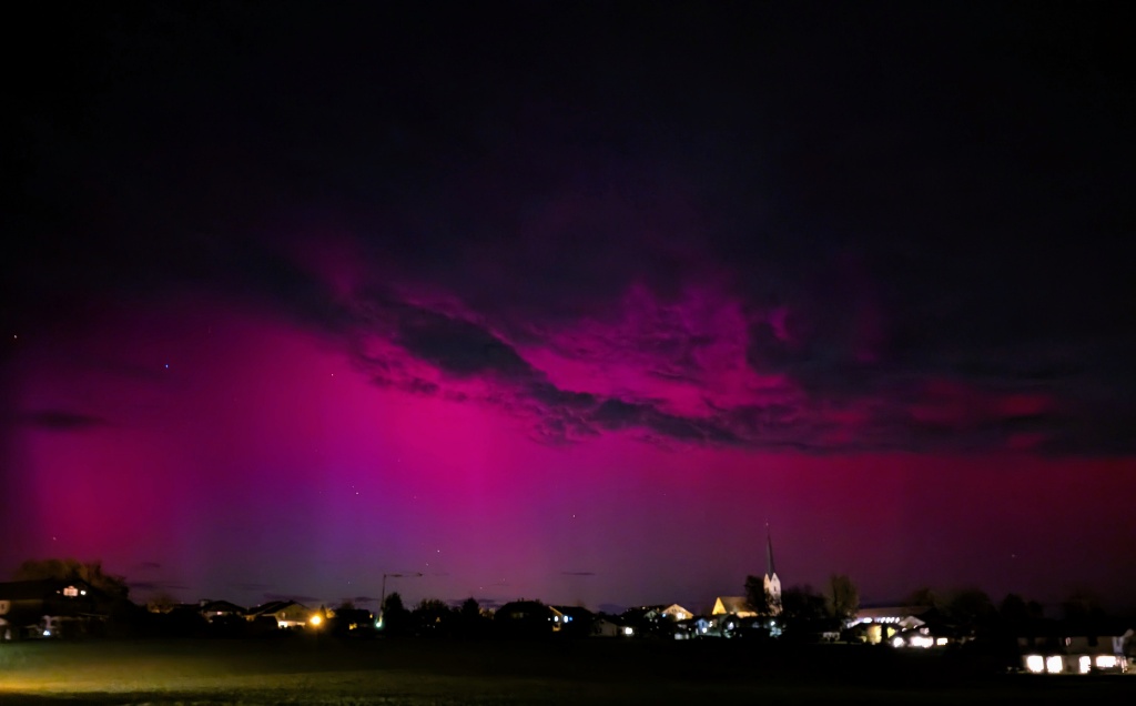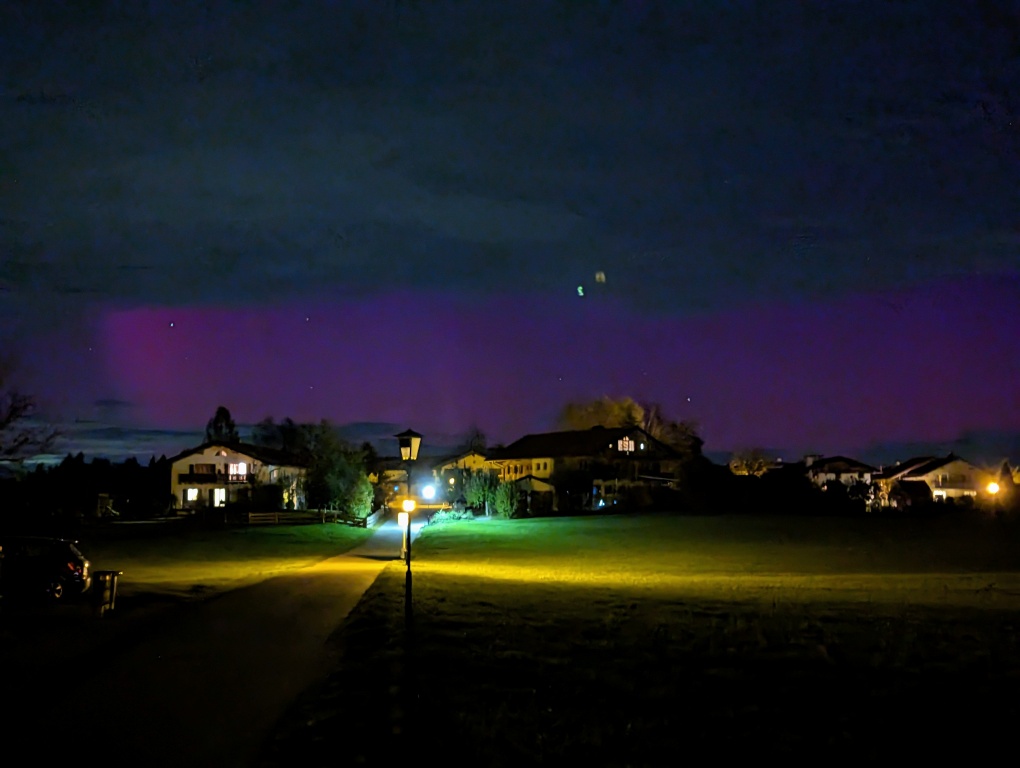 Hier im Chiemgau war das Polarlicht auch gut zu sehen, v.a. zwischen 18:10 und 18:20, wo der Nordhimmel richtig hell rot war. Danach war noch bis ca. 18:35 ein schwacher rötlicher/violetter Schimmer zu erkennen.