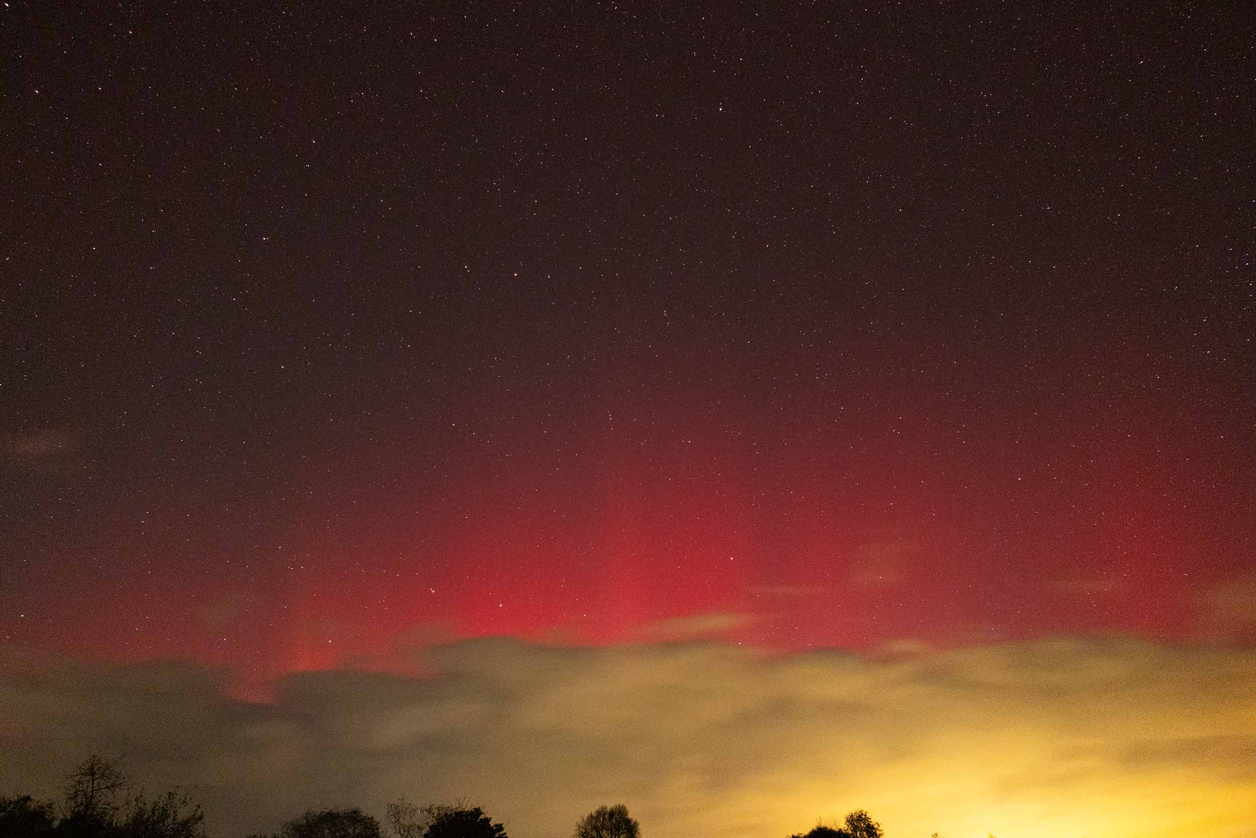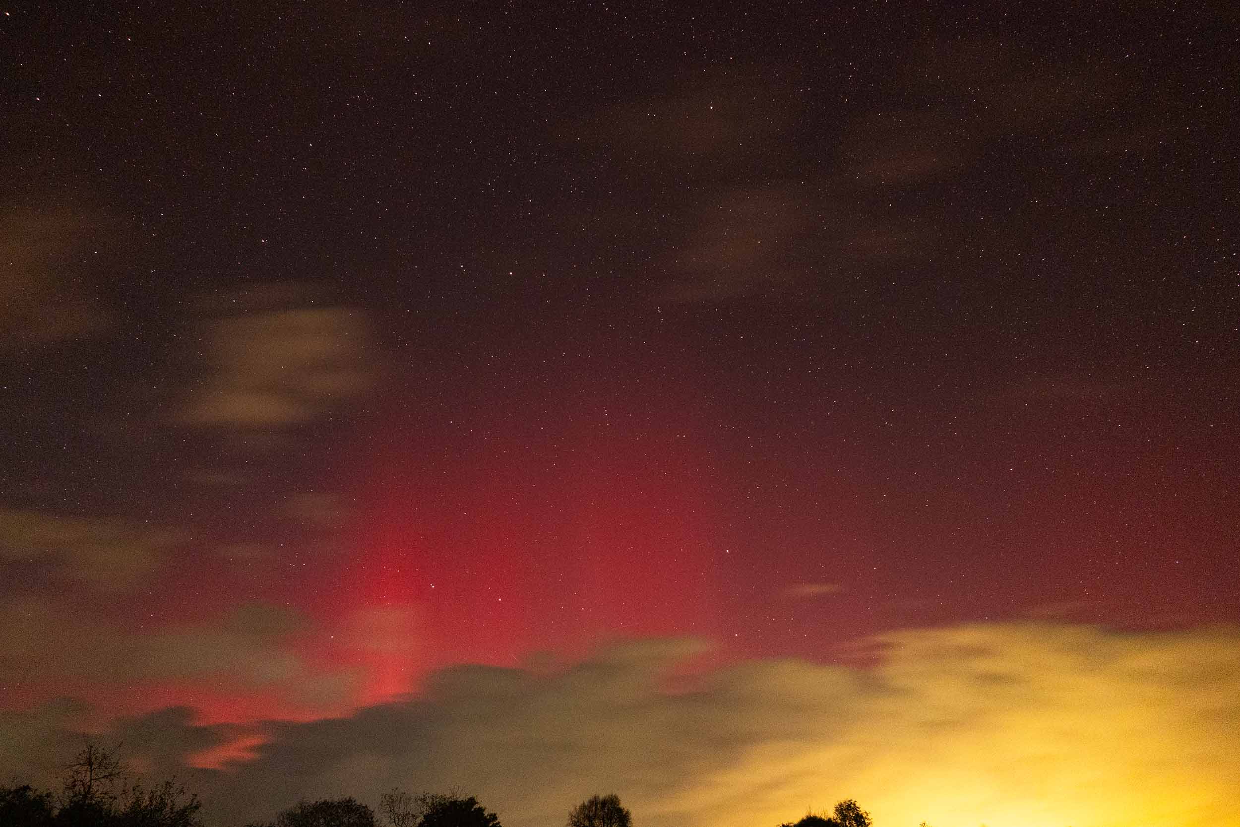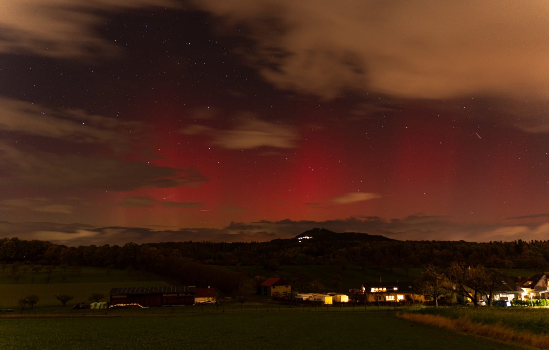 Anbei auch meine (eventuell von heute erste) Sichtung. Wie oben ersichtlich, hatte ich die Aufnahmen deutlich weiter südlich gemacht, da es bei mir Zuhause einfach nicht auflockern wollte. Aber auch bei dem Standort zogen einige Wolkenfelder durch und behinderten besonders nach Norden noch oft die Sicht (vielleicht hätte ich doch noch weiter nach Süden gemusst). Bei den ersten Aufnahmen fiel mir sofort ein roter Bogen auf, der fast bis zum Zenit reichte und besonders im Nordwesten eine ordentliche Helligkeit aufwies. Mit kam gleich der Verdacht eines SAR-Bogens. Der war übrigens nicht nur rot, sondern auch weiß! Das Weiß konnte ich sogar schwach visuell erkennen. Gegen 20:45 Uhr UTC ging dann die Aktivität deutlich nach oben und im Norden zeigte sich dann schönes rotes Polarlicht. Von der Helligkeit trotz der Wolken deutlich visuell, die rote Farbe konnte ich ohne Probleme erkennen. Teilweise zeigten sich auch sehr schöne Strahlen. Hier ein paar Bilder: Bilder übrigens alle mit einer Canon EOS R8 mit 24 bis 50mm.