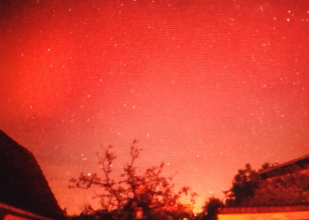 Hellrotes Polarlicht am frühen Abend in 03185,Drehnow gesichtet. Schlechte Sicht aufgrund der Wolken aber die Kamera hat es trotzdem erfasst.