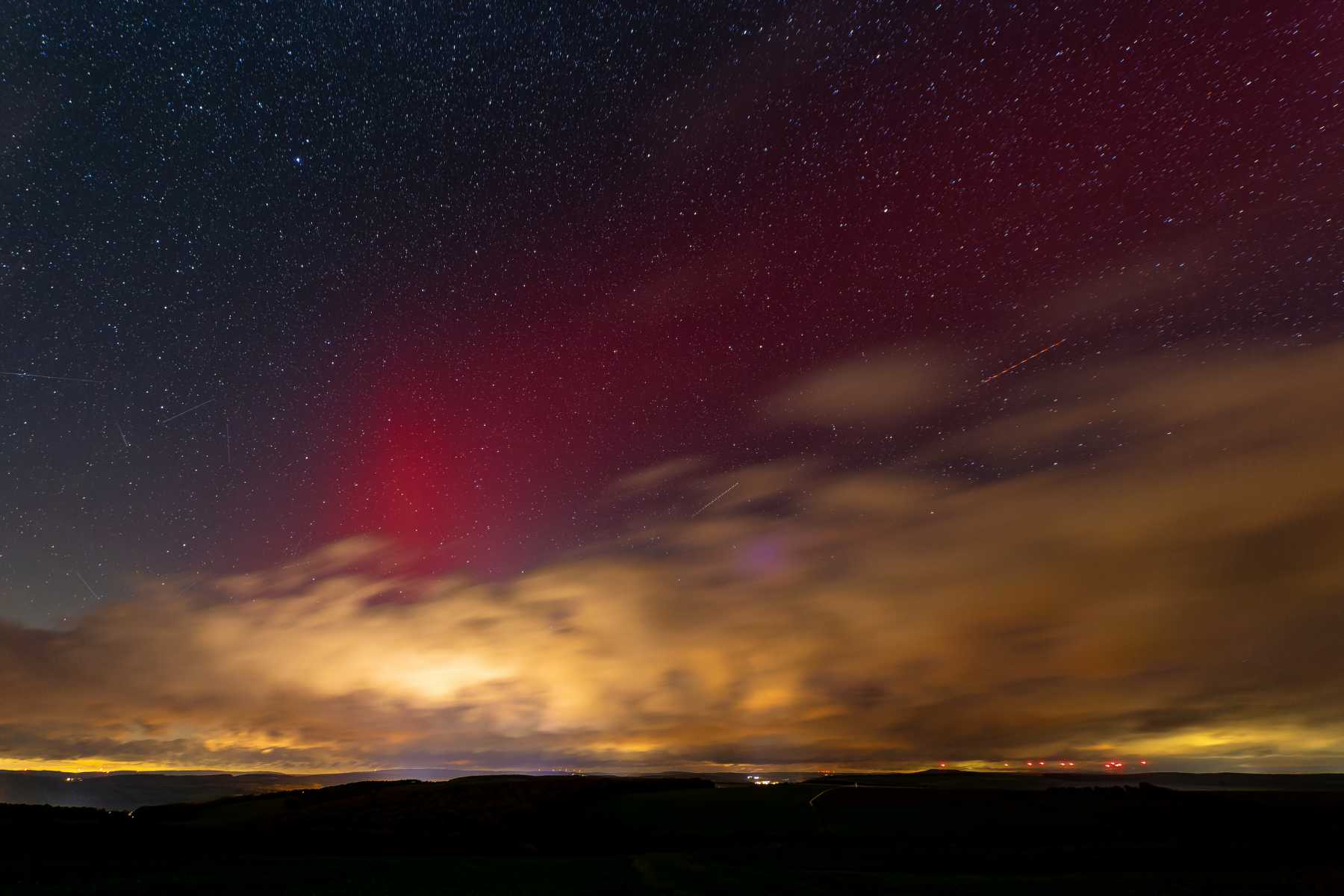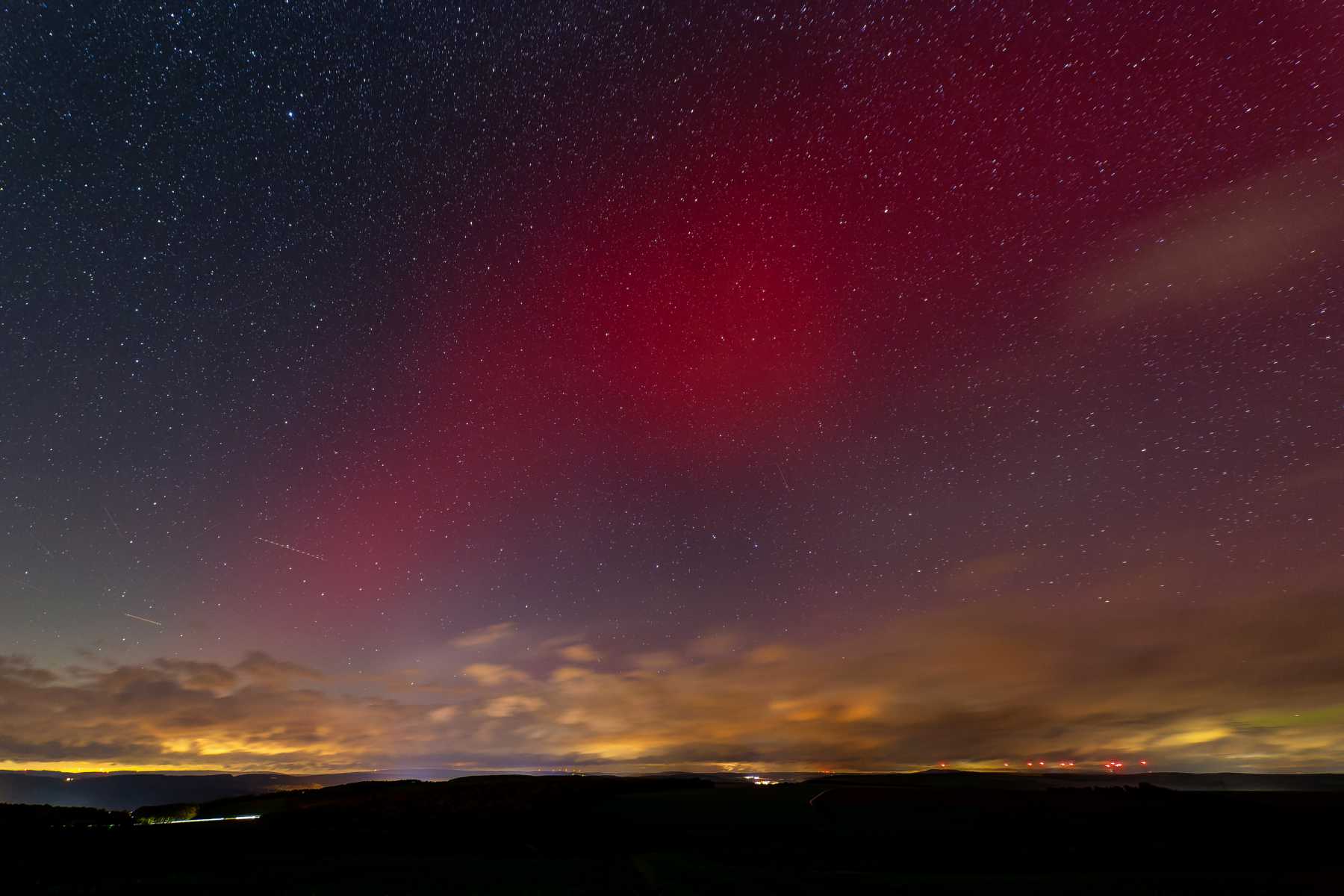 Gegen 19:00 habe ich mich dann (erstmals überhaupt) entschlossen wegen Polarlichter rauszufahren, und eine nahgelegene Stelle mit Nordhorizontblick genutzt, mit Blick auf die sonst sehr störende Bad Camberger Lichtglocke im Norden von uns. Gegen 20:26 dann der zweite Höhepunkt (meine erste visuelle Sichtung überhaupt):