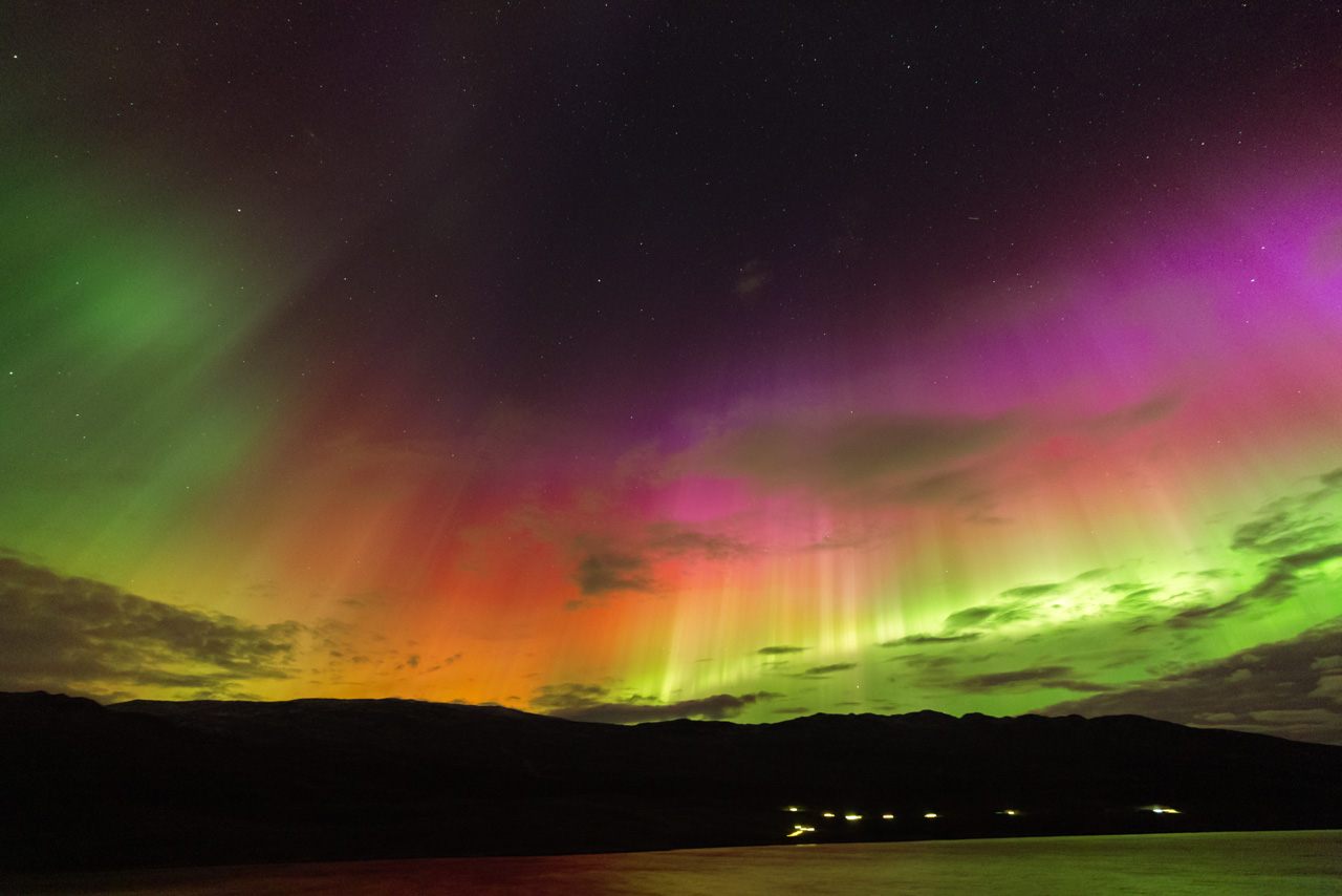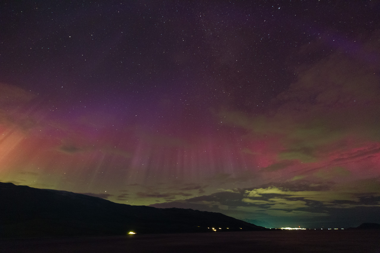 Ich war da mit einem Passanten am Quatschen, als wir beide die Polarlichter auch mit bloßem Auge gesehen haben - wie bei Dir farblos, aber ganz kurz war (mit nachtadaptierten Augen) ein schwaches rotviolettes Schimmern zu sehen. Hier zur gleichen Zeit mit 14mm: