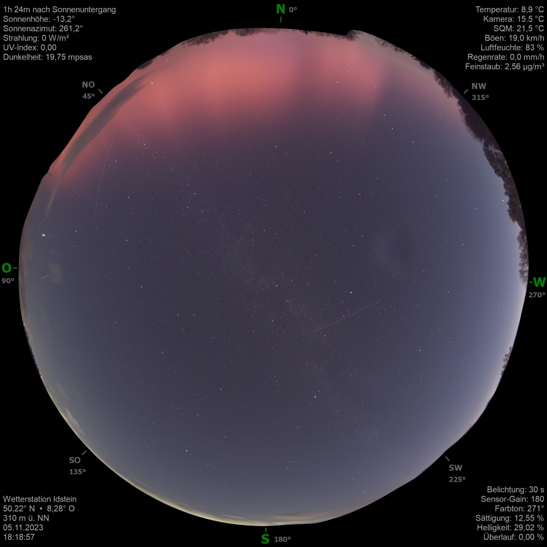 das ist ja witzig und erfreulich, dass meine Allsky-Kamera auch außerhalb von Idstein nutzvolle Verwendung findet. Ich hab die Polarlichter tatsächlich auch erst durch die Live-Ansicht auf meiner Wetterseite bemerkt. Die gingen so hoch, dass die 5° bis 7° des - durch Häuserreihen - geblockten Nordhorizonts keine Rolle spielten (ich wohne in einer Hanglage, nach Norden aufsteigend).