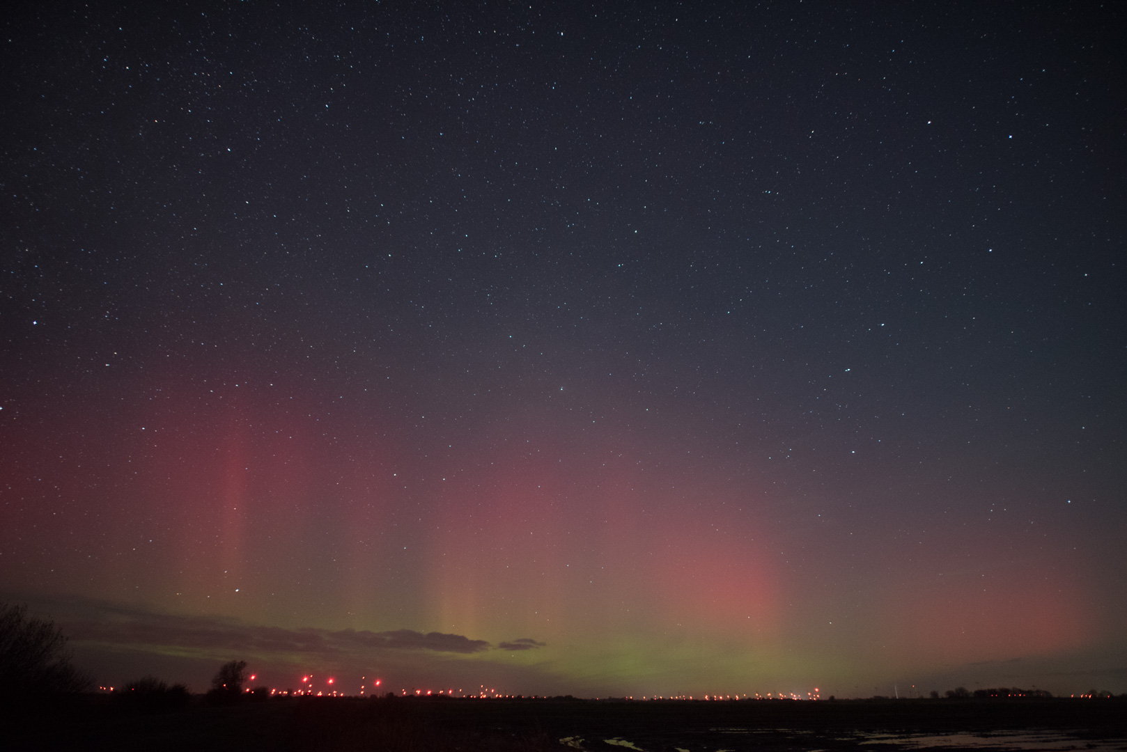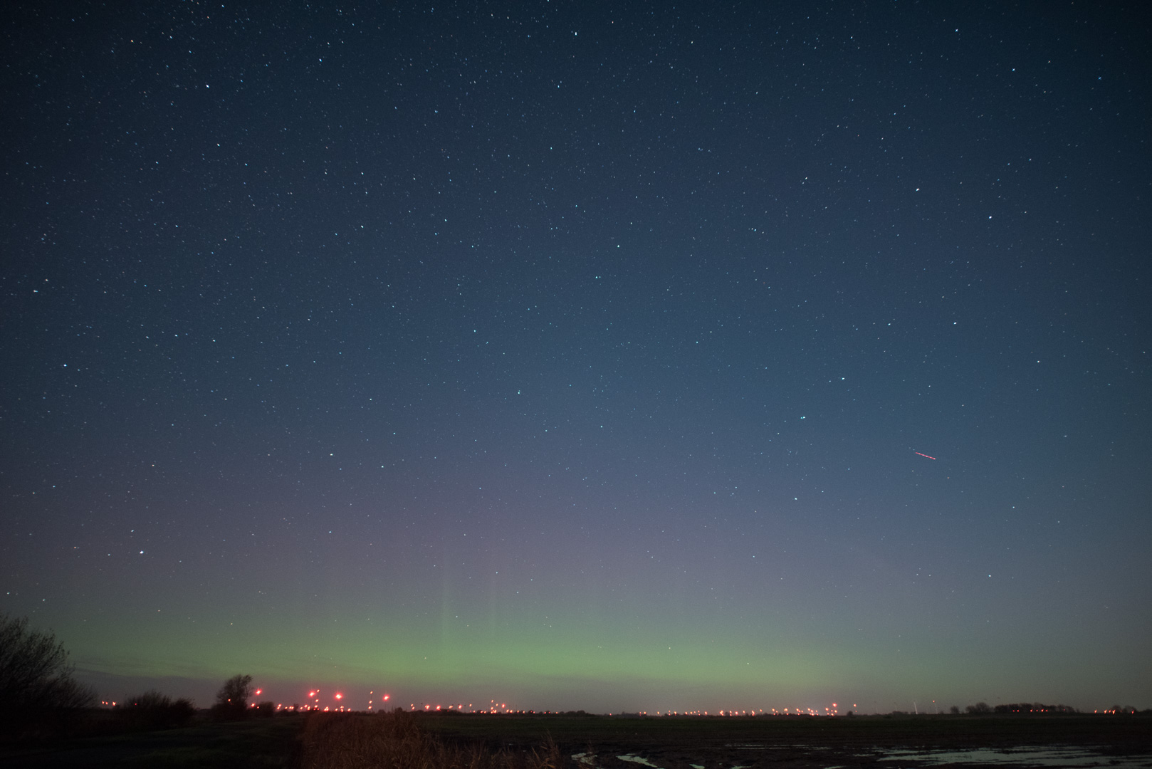 Ich konnte zwischen 23:55-1:45 UTC mit der Kamera fotografische Polarlichter feststellen und rund 15 Kilometer südlich von Lübeck diese Aufnahme ergattern