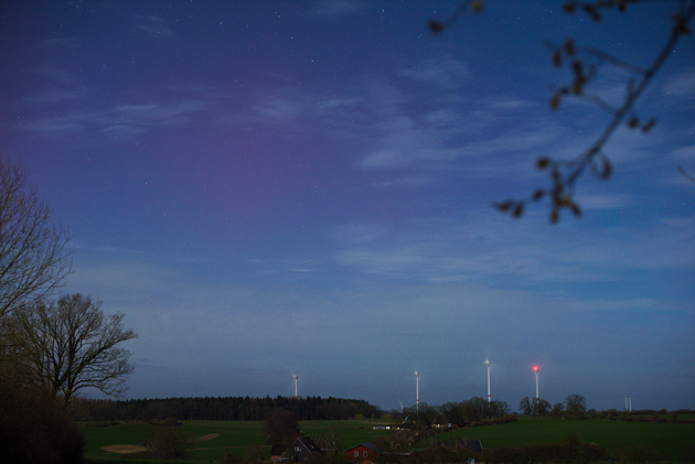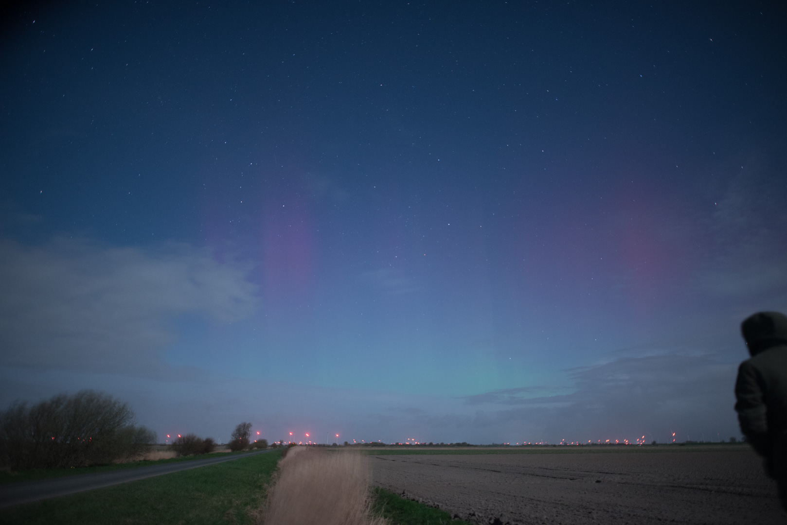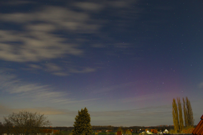 - Kommentar: Ich habe am Anfang der Beobachtungen bei schnell wechselnder Bewölkung zwischen Bad Oldesloe und Poggensee für ein paar Minuten das grünliche Polarlichtband wenige Grad über dem Horizont schwach visuell sichten können. Später war das Nordlicht nur noch fotografisch nachweißbar mit ein paar rötlichen Beamern, der Mond störte ziemlich stark....