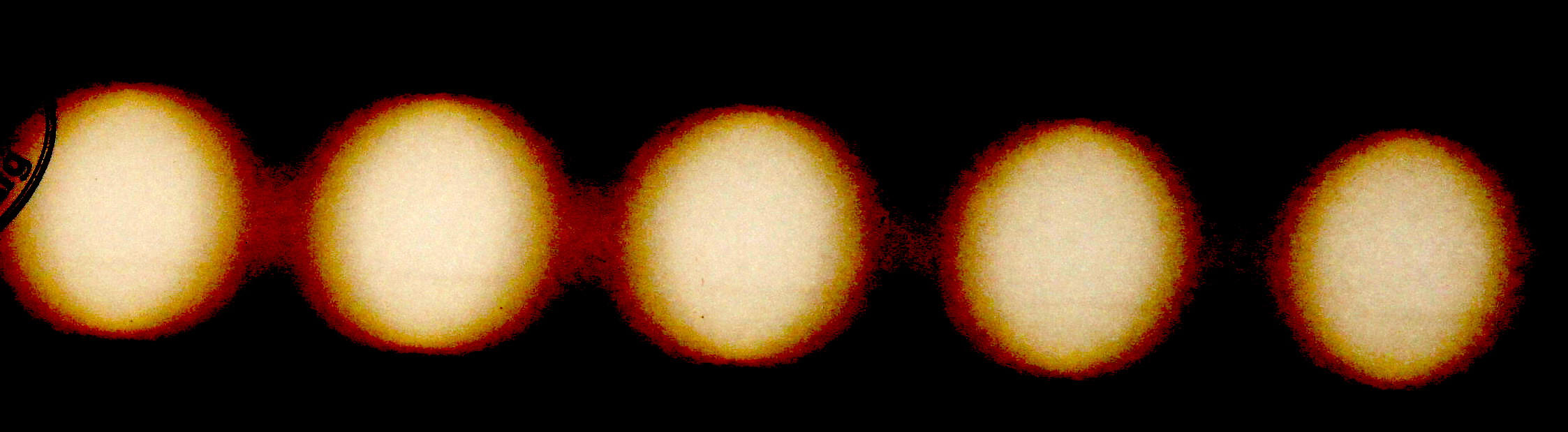 der grosse Sonnenfleck AR3590 befindet sich nahe des Sonnenmeridians und ist mit einer So-Fi-Brille ein auffälliges, leicht längliches Objekt. Der Versuch, ihn wieder mittels Projektion durch die Öffnungen des Rollladens einzufangen scheiterte diesmal an den länglichen Schlitzen, so dass nur ein in die Länge verzerrtes Sonnenabbild entstand. Aber zu meiner großen Überraschung, zeigte sich der Fleck als Linie (!) in der Projektion auf einem weissen Couvert. Da die Projektion invertiert ist, ist Norden unten und der Fleck erscheint damit unterhalb der Sonnenmitte. Die Linie war mit freiem Auge problemlos auf der Projektion zu erkennen, aber mit dem Fotografieren war es schwieriger. Die Fotos entstanden zwischen 10:42 und 10:52 MEZ. Man muss sich in die Bilder "hineinsehen", um die Linie zu erkennen. Daher habe ich sie im ersten Bild mit Pfeilen markiert und die Bilder nochmals stark kontrastverstärkt: