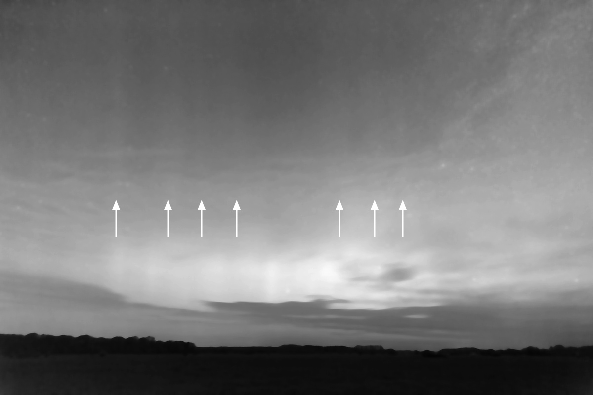 Nach Analyse der Blaukanäle meines Zeitraffers kann ich sagen, dass der erste GBR um 02:41 MESZ auf Nordwest auftaucht. Danach bildet sich zeitweise ein regelrechter Vorhang aus sehr schwachen GBR, der bis zu meinem Ende der Beobachtung vorhanden war.