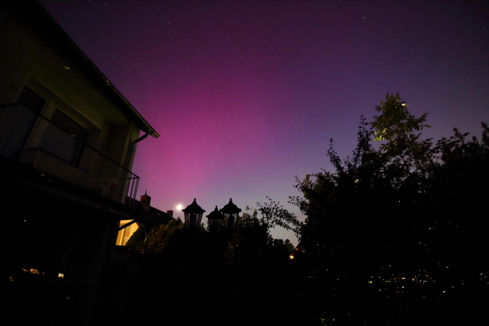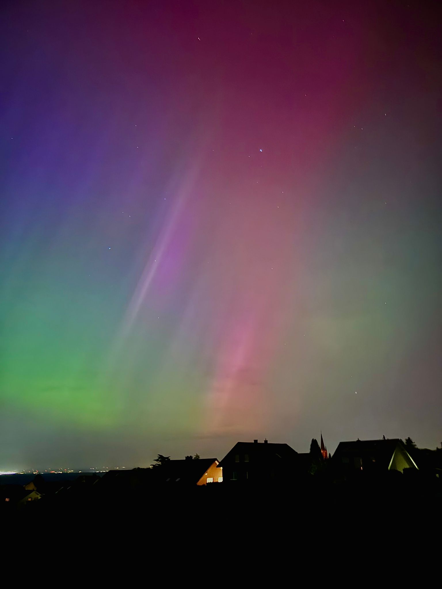 Trotz der Lichtverschmutzung in der Stadt konnte ich von ca. 22:15 bis 22:35 Uhr deutlich visuell ein Polarlicht erkennen. Aber auch noch mehrere Stunden später war mit der Kamera immernoch etwas rot bis violett/grün zu erkennen.