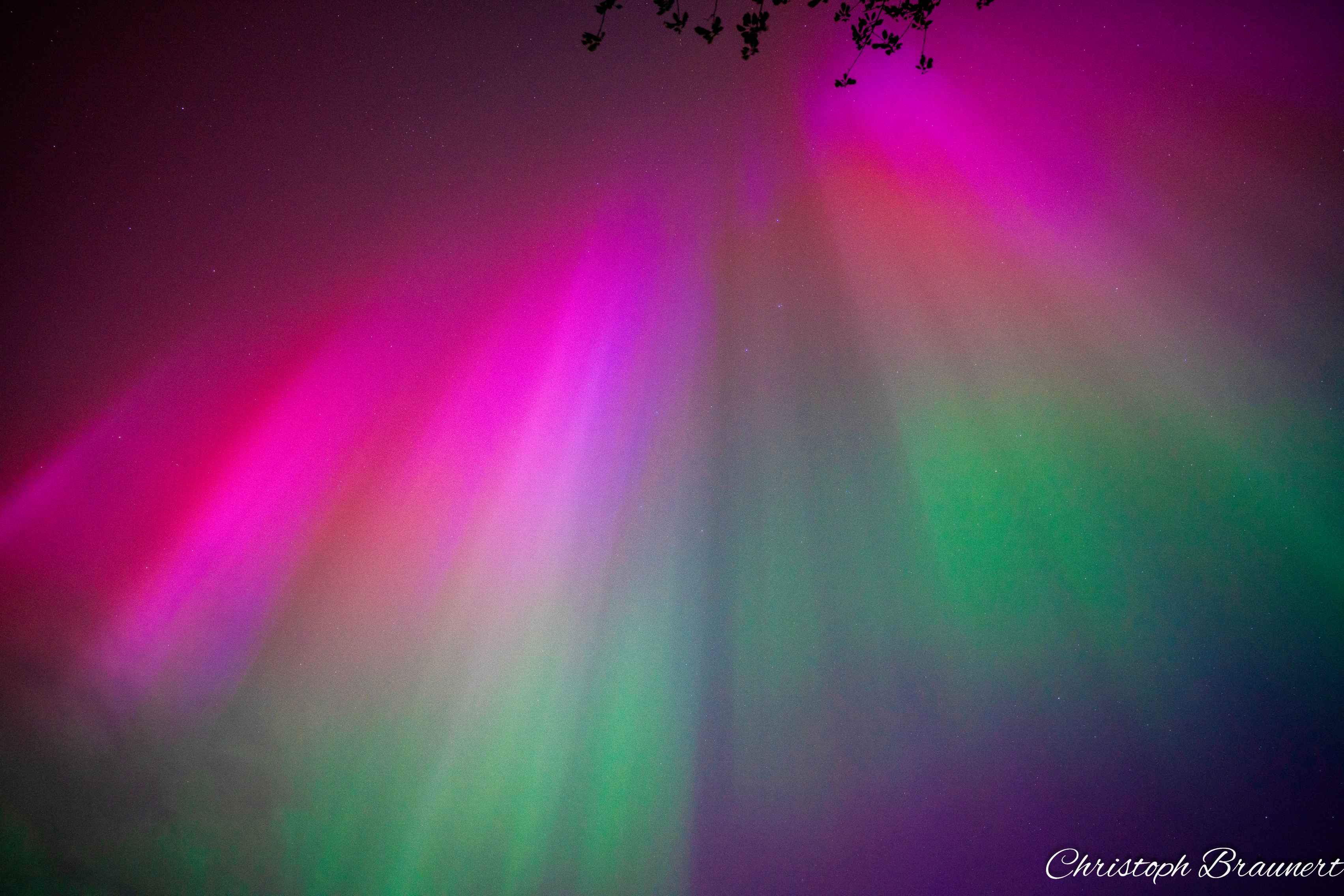 Hier im Nordschwarzwald war Polarlicht sichtbar bis es hell wurde. Nach dem ersten kräftigen roten Peak war es aber nur noch schwach visuell. Im Laufe der Nacht verschoben sich die Farben ins Violette (rechts war noch ein großer, roter Fleck, aber der ist beim geradebiegen des Bildes weitgehend abgeschnitten worden: