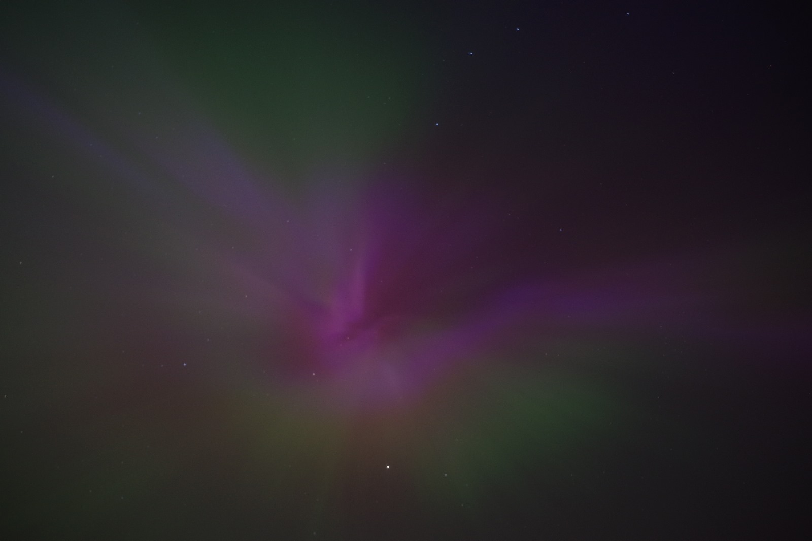 Gegen 23:30 Uhr UTC nahm die Aktivität dann ab, es blieb aber dennoch ein grüner Bogen mit rot-violetten Strahlen übrig: