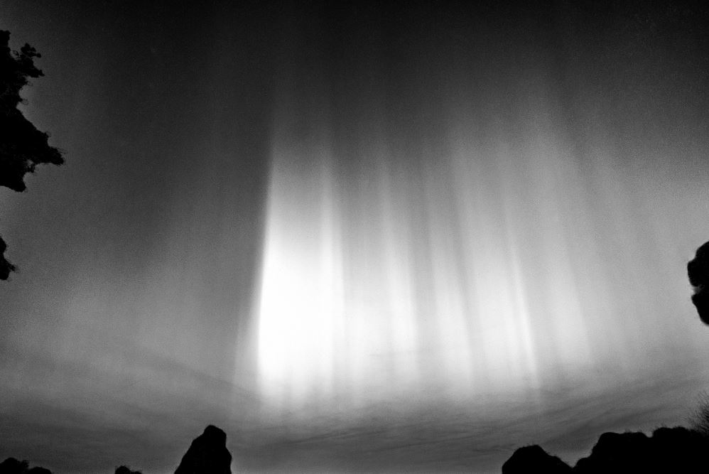 Gegen Ende meiner Beobachtung, gegen 3:30 MESZ, als es anfing zu dämmern, fiel mir ein farbloser gigantischer Strahl auf, der sich "in meinem Rücken- also südlich befand.