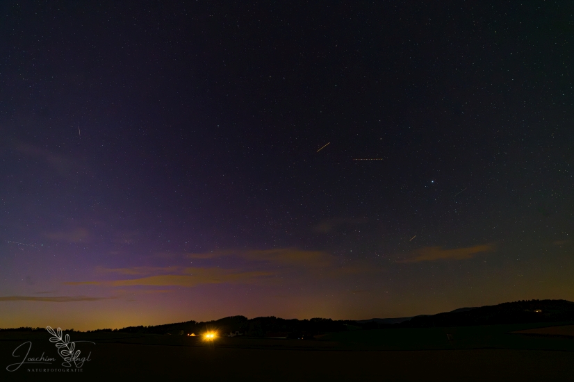 Zwischen 23:19 Uhr und 0:09 Uhr konnte ich fotografisches Polarlicht nachweisen. Zwischen 23:19 Uhr und 23:24 Uhr war es sogar schwach visuell zu erkennen. In diesem Zeitraum waren deutliche Beamer zu erkennen und auch fotografisch nachweisbar. Danach war nur noch ein violettes Leuchten fotografisch erkennbar.