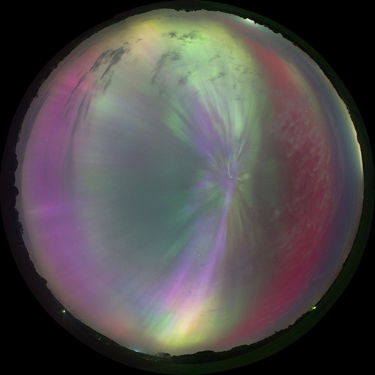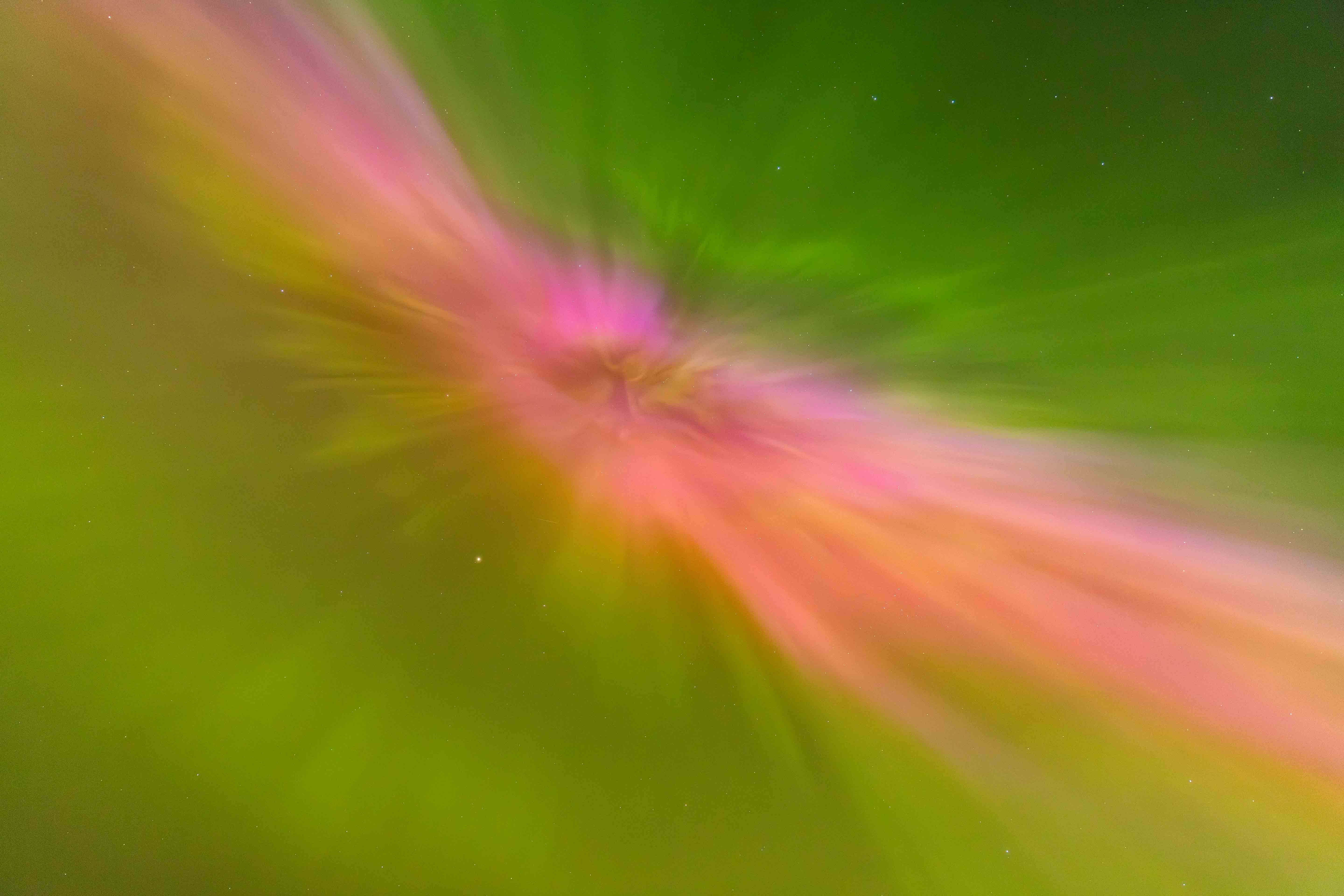 Zuerst waren die Polarlichter nur fotografisch. Es baute sich erst ein rotes Feld auf, dann grün, dann kamen die sog. "Vorhänge" in grün, die intensiver wurden. Bis dahin waren sie nur fotografisch und mit bloßem Auge nicht zu sehen. Doch dann waren sie auch schwach visuell zu sehen, in Form eines helleren Feldes. Auf den Fotos waren sie dann natürlich farbig, in wundervollen grünen und pinken Farben.