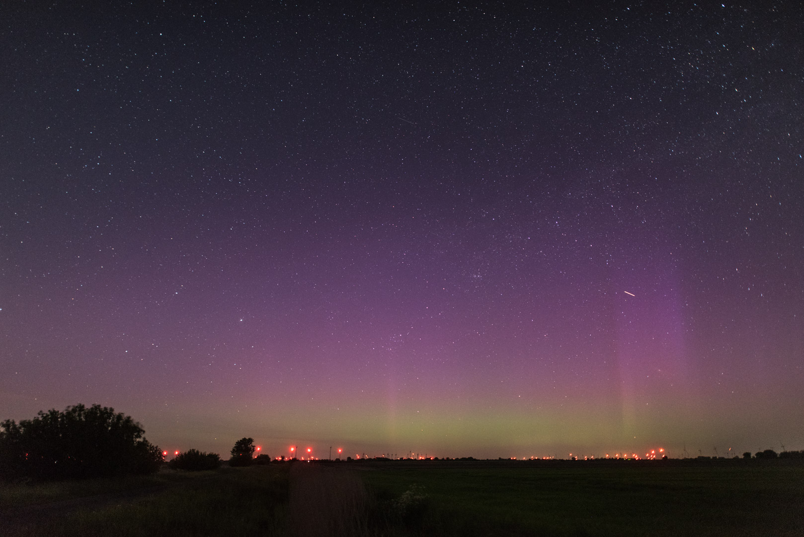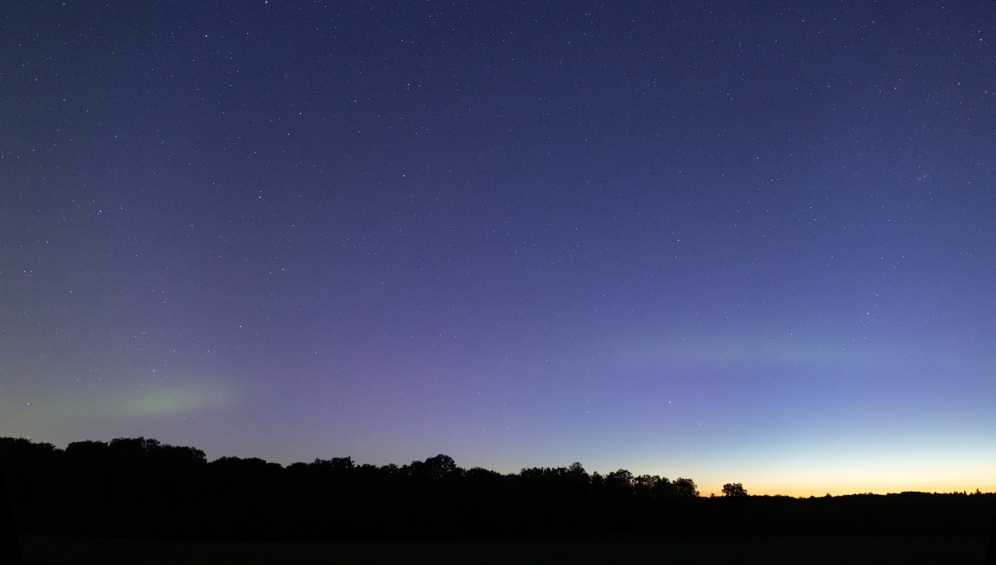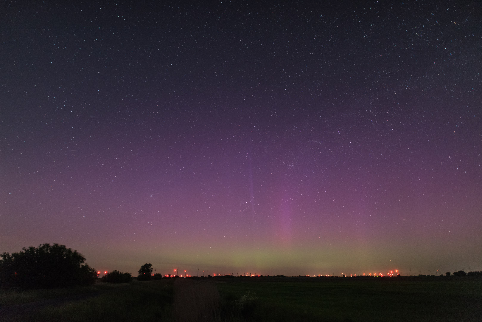 Meine Beobachtung begann etwa 23:15 MESZ in der Nähe von Mühlrade, 30 km östlich von Hamburg. Schon in den ersten Fotos war schwaches, fotografisches Polarlicht erkennbar. Während der Substürme waren Polarlichtstrahlen zeitweise schwach visuell sichtbar.
