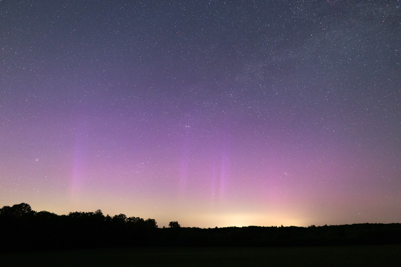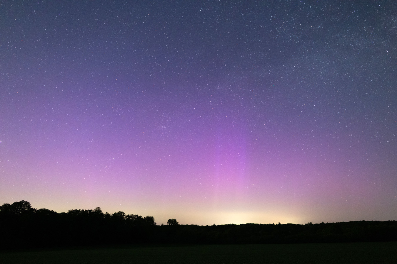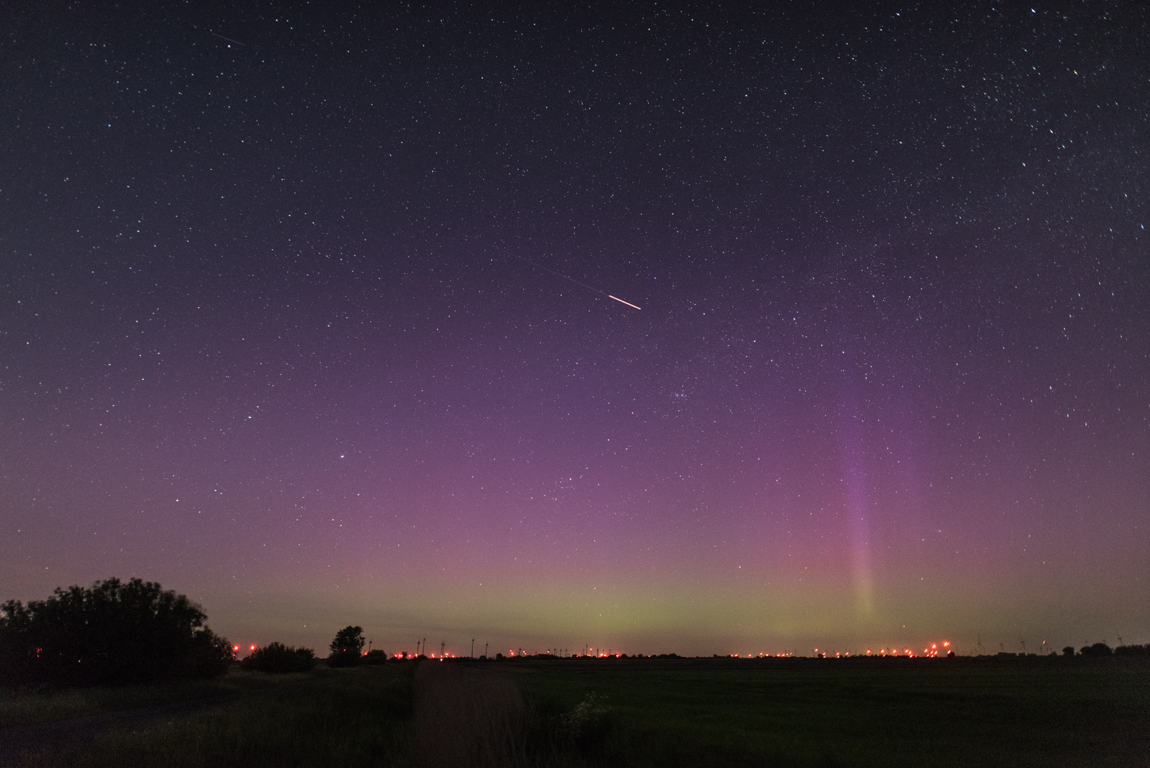 Meine Beobachtung begann etwa 23:15 MESZ in der Nähe von Mühlrade, 30 km östlich von Hamburg. Schon in den ersten Fotos war schwaches, fotografisches Polarlicht erkennbar. Während der Substürme waren Polarlichtstrahlen zeitweise schwach visuell sichtbar.