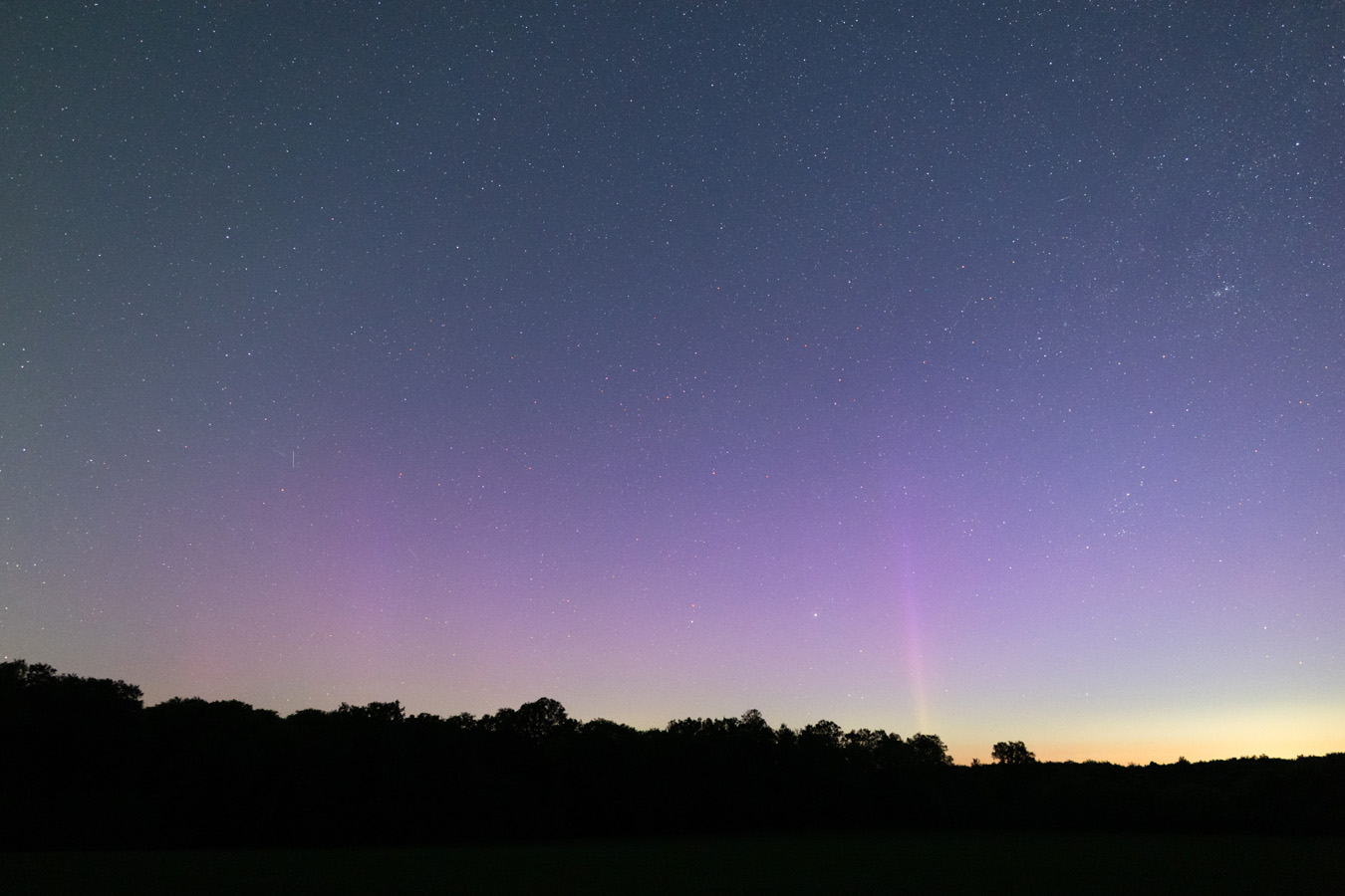 Da die Werte am DSCOVR bzw. ACE sich nochmal freundlich entwickelten, bin ich kurzentschlossen rausgefahren. Gleich zu Beginn war fotografisches rotviolettes Polarlicht bis zum Ende der Beobachtung nachweisbar. Ebenso sind Strahlen schemenhaft im Zeitraffer fotografisch nachweisbar. Lediglich für wenige Minuten wurden einzelne Strahlen schwach visuell.