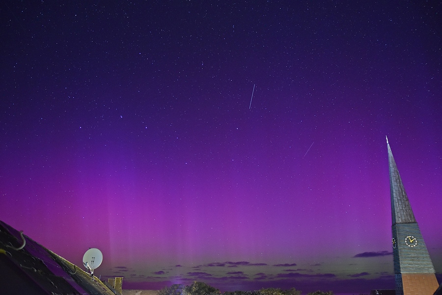 Ich habe durch Zufall ab ca 2.24 Uhr MESZ bis 3.15 Uhr MESZ zeitweise sehr intensives Polarlicht in Flensburg aufnehmen können. Die Beamer waren deutlich visuel in grau wahrzunehmen. Zeitweise war der ganze Himmel rötlich gefärbt. Ein paar Sternschnuppen wurden auch eingefangen.