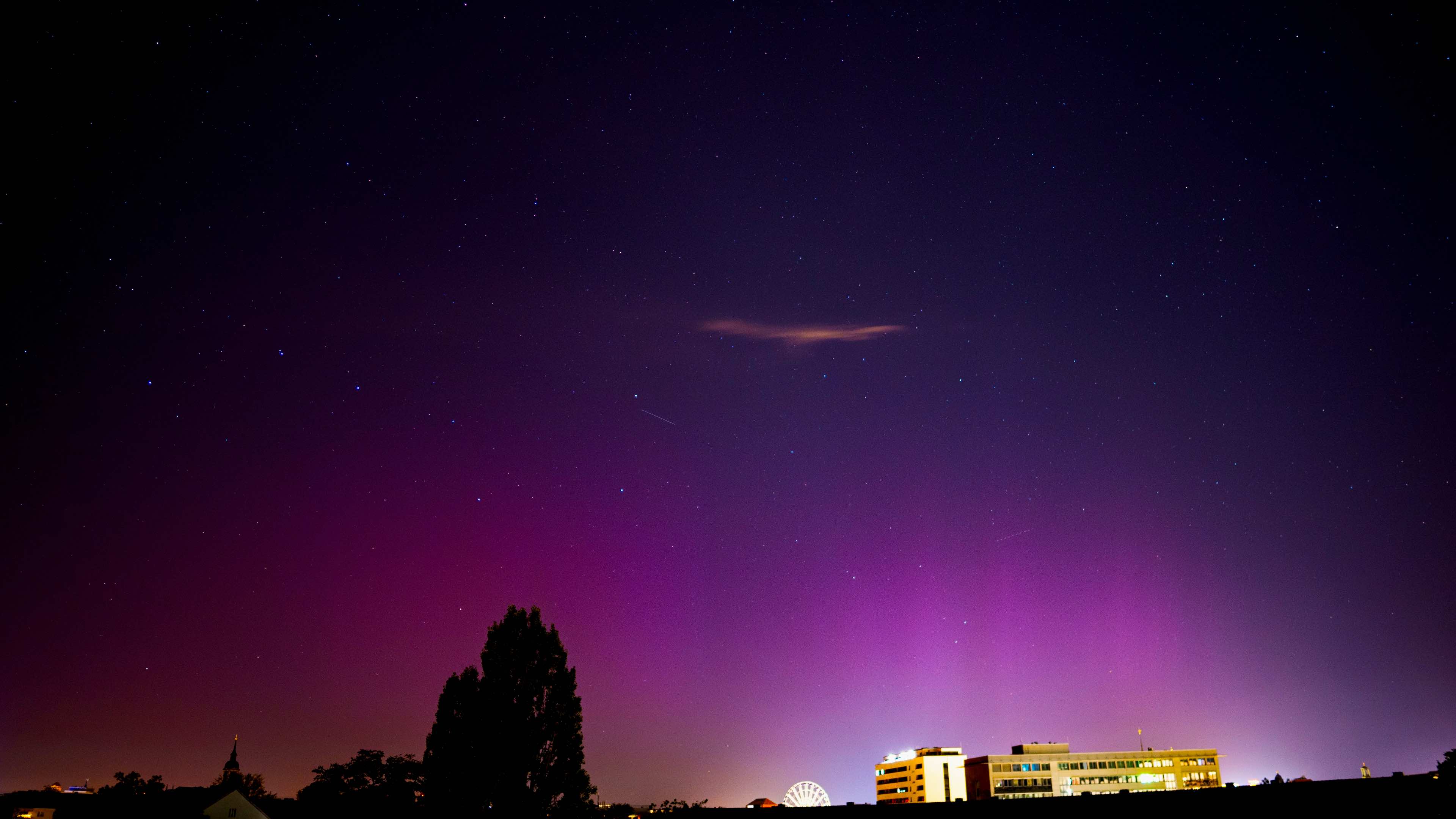 Fotografisches Polarlicht über der City von Dresden. Die Polarlichter waren zwischen 01:45 und 02:30 MESZ sichtbar.