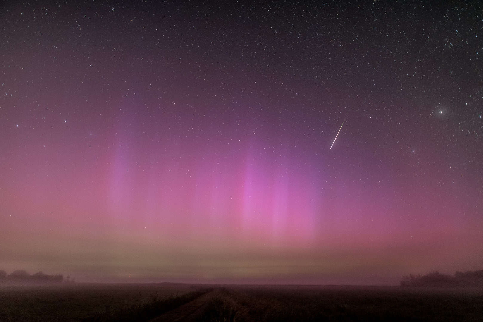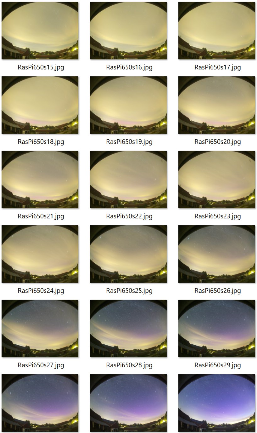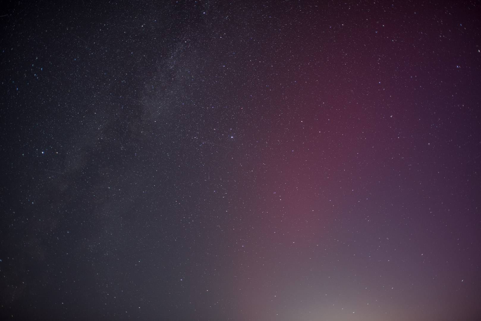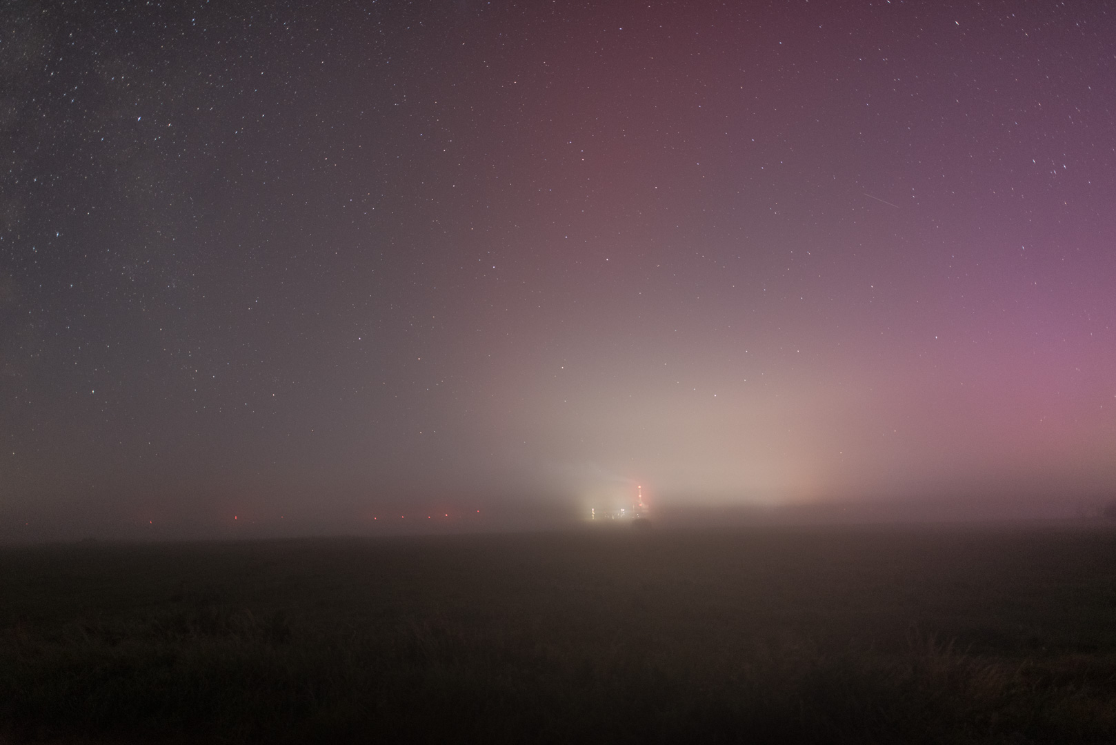 Bis ca. 23:45 UTC war nur fotografischen PL zusehen. Zwar gab es am Horizont einen aufgehellten Bogen, der dem gelbgrünen Matsch auf dem Kameradisplay entsprach, aber zu einer schwach visuellen Sichtung mochte ich mich nicht durchringen. Das brauchte ich auch nicht, da innerhalb kurzer Zeit der Substorm einsetzte und sich Strahlen deutlich visuell abzeichneten. Rot und grüne PL-Anteile wurden schwach visuell sichtbar. Da ich nicht länger als 00:45 UTC beobachten wollte, begann ich die Beobachtung abzubrechen und wollte mit dem letzten Bild noch einmal die Milchstraße aufnehmen. Verblüfft stellte ich fest, daß über mir der Himmel rot war. Der SAR war mir glatt durchgegangen.