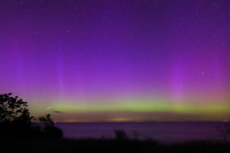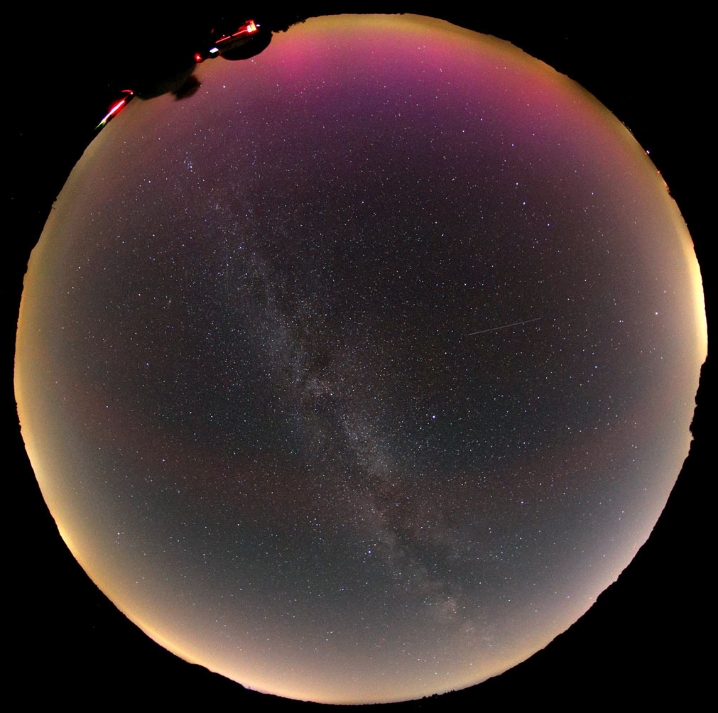 Zwischen 23:10 und 23:30 konnten schwach visuellen Strahlen über einem grünen Polarlichtband gesichtet werden.