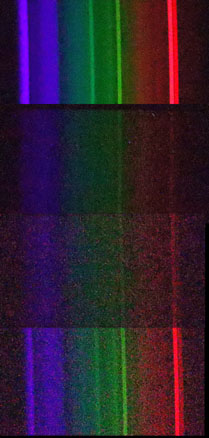 Deutlich visuell wahrnehmbare helle Strahlen, teilweise rötliche bis rotviolette Farben erkennbar.