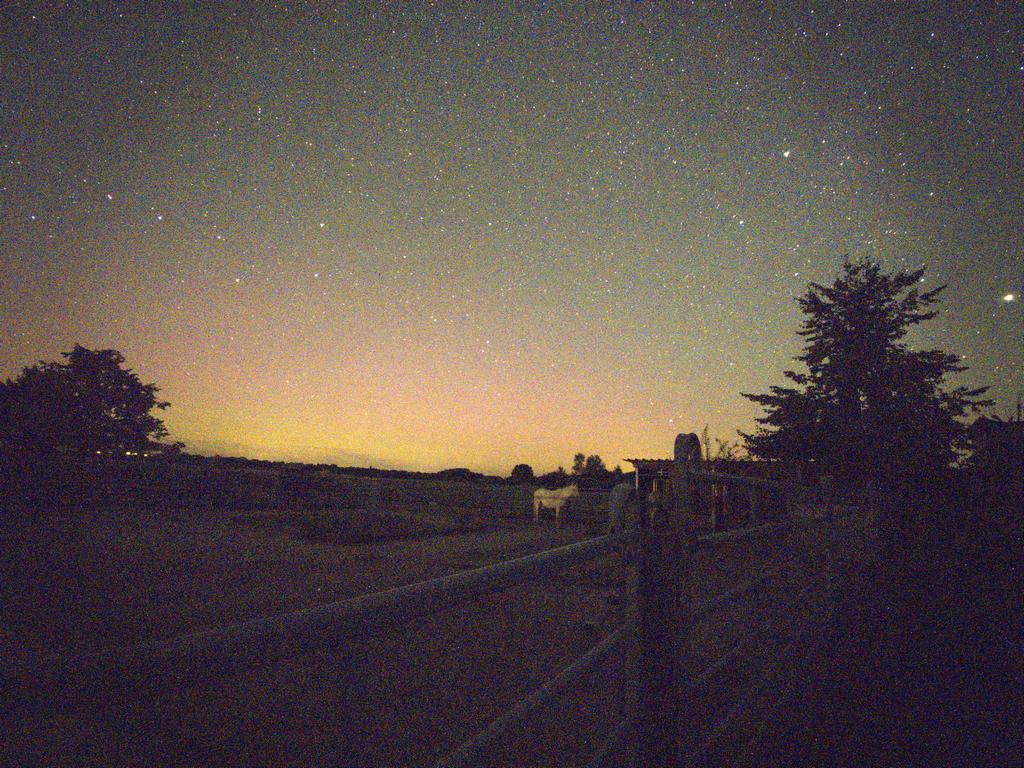 und ganz zum Schluß um 01:35 MESZ noch Polarlicht mit Pferd - auf dem Gestüt in Köhn-Mühlen (54.35, 10.48)die Pferde staunten nicht schlecht über den nächtlichen Besuch