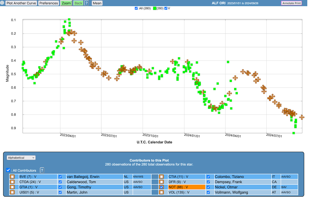danke für das Update. Auch ich habe Beteigeuze am 7. und 8.9. unter sehr guten Bedingungen (von 575 m Höhe in der Oberlausitz) mit nur jeweils +0,95 mag gemessen, das ist noch unter der provisorischen Lichtkurve der AAVSO. Am 28.8. waren es noch +0,87 mag und ausgangs der Wintersaison am 13. und 24.2. jeweils +0,72 mag. Im Januar 2024 war Beteigeuze noch deutlich heller und hatte im Mittel von Messungen an sieben Tagen +0,46 mag.
