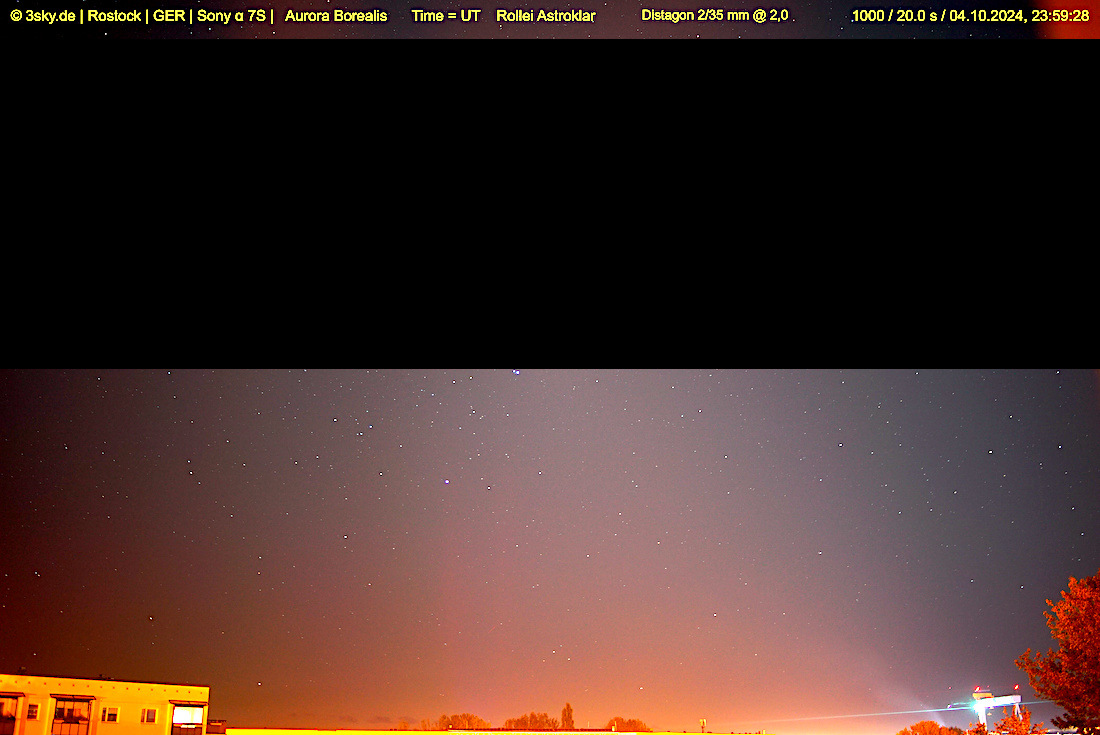 Kommentar: Ich hatte in dieser äußerst klaren Nacht Sterne direkt über dem Horizont beobachten können, desweiteren habe ich vor Sonnenuntergang in Delphinemünde schon eine außergewöhnliche Klarsicht beobachten können. Leider gab es keine Sichtung der Aurora und somit konnte ich nur 2 einigermaßen nennenswerten Aufnahmen machen mit kleinen Beamern. Eine Aufnahme ist von 22:39 Uhr und die Zweite ist von 00:05 Uhr MESZ.