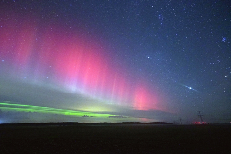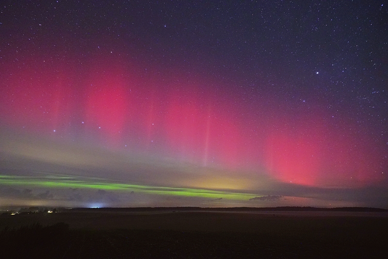 eine wahre Polarlicht Explosion ereignete sich am 07.10.2024 gegen 23 Uhr bei Wolfsburg Sülfeld in Niedersachsen. Es waren deutlich visuelle (graue Schleier und Striche) rote Beamer zu beobachten, zusammen mit grünem Polarlicht in Bändern. Das ganze Schauspiel hielt etwa 30 Minuten an, danach glimmte es noch etwas nach.