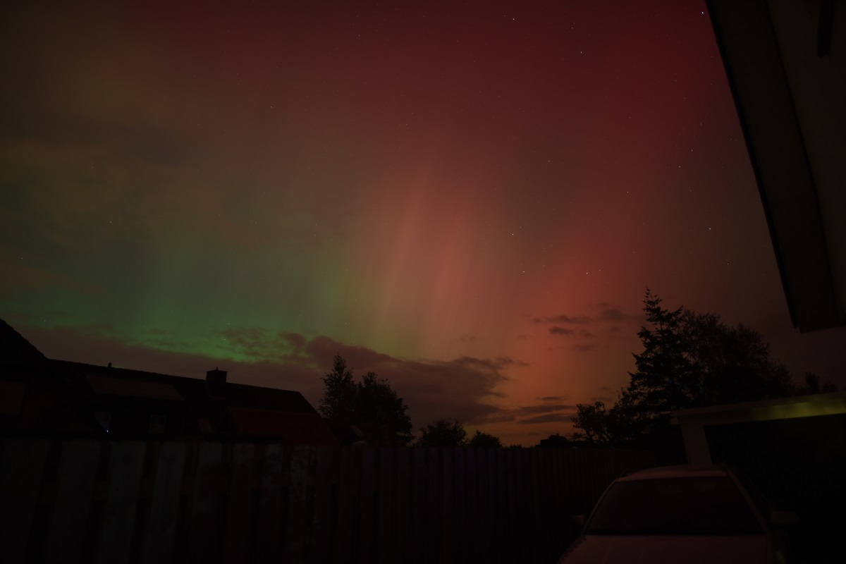 Gegen 20:00 war ich mit meiner Frau noch bei einem Freund, wo wir jedoch auch bereits rote Verfärbungen am Nordhimmel feststellen konnten. Wir sind dann gegen 22:15 Uhr nachhause, in der Hoffnung, mit der Kamera noch etwas reißen zu können. Gegen 22:30 eskalierte es dann völlig und man konnte mitten im Gewerbegebiet auf der Geniner Straße in Lübeck, trotz Lichtverschmutzung, ohne Probleme rote Strahlen sehen.