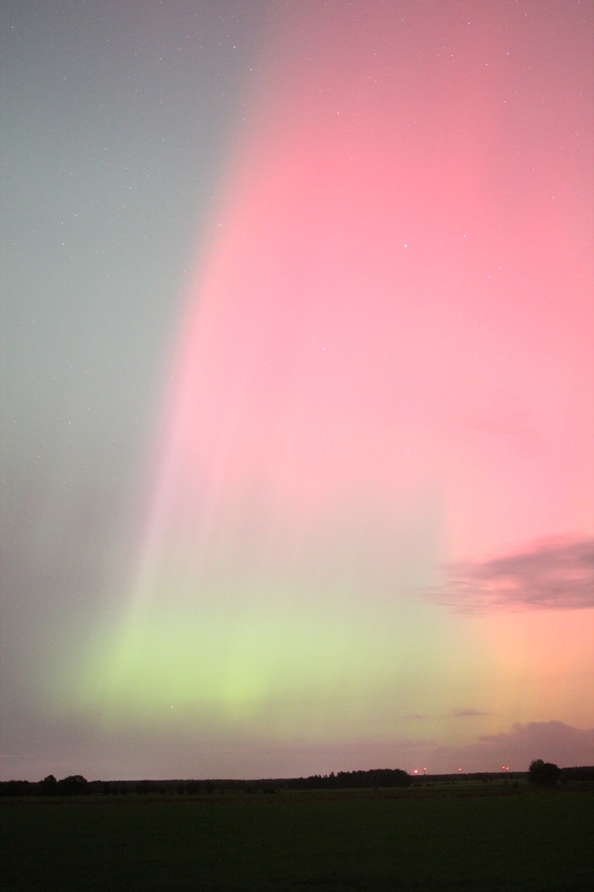 Beobachtungsbericht: Ich habe mir diesmal einen etwas dunkleren Standort gesucht, der auch mehr freien Blick Richtung Osten hat. Das war im Nachhinein die beste Entscheidung. In der Dämmerung war erstmal noch nichts zu sehen, es zogen einzelne Wolken durch. Ab etwa 19:40 MESZ schaute der grüne Bogen über einer Wolkenbank im Norden heraus. Langsam gesellten sich violette Schimmer dazu. Alles nur fotografisch sichtbar. Gegen 20:00 MESZ gab ein kurze Aktivitätsphase mit einigen Beamern, diese kündigten einen ersten Substurm ab. Pünktlich dazu zog es fast komplett zu. In den Wolkenlücken war aber rot und Violett auf den Fotos zu erkennen. Ab 20:40 MESZ klarte es dann wieder auf. Der grüne Wahnsinn beginnt, ab jetzt war es auch schwach visuell zu erkennen. Begleitet wurde der grüne Wahnsinn durch einige rote Beamer. Um 21:00 MESZ wurde es dann erstmal wieder ruhig für etwa 30 Minuten. Dann gewann der grüne Bogen deutlich an Helligkeit und stieg in die Höhe. Großes Feuerwerk mit visuell deutlich sichtbaren Beamern ab 22:20 MESZ. Bis 23: 00 MESZ erfasste das Polarlicht den gesamten nördlichen Himmel von Ost über Nord bis West. War im Osten aber viel heller. Rote Beamer hell bis sehr hell visuell zu erkennen, auch die Bewegung war erkennbar. Das grüne Polarlicht war ebenfalls visuell hell erkennbar, blieb aber eher gräulich. Um die Zeitherum war auch der SAR-Bogen fotografisch nachzuweisen. Danach flaute die Aktivität wieder ab, fotografisch tanzten im Osten rote und grüne Polarlichter aber lange Zeit umher. Die Helligkeitswechsel des grünen Polarlichts waren schnell. Um 23:45 zog der Himmel dann leider sehr zügig zu, so dass ich den nächsten Substurm um 1:00 MESZ nicht beobachten konnte.