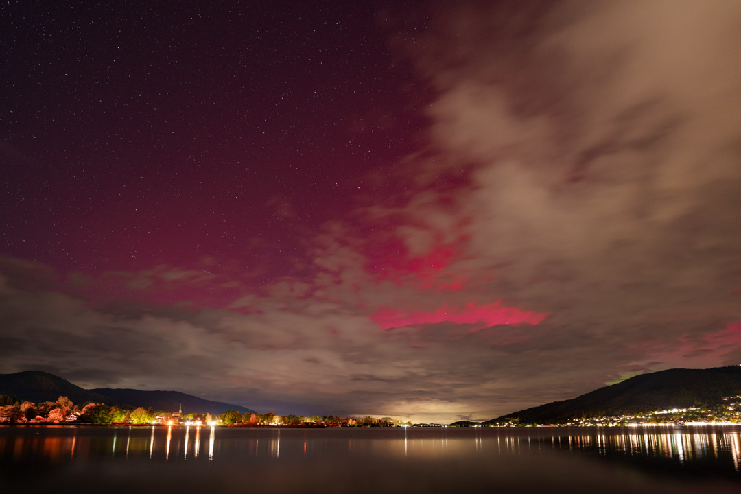 Wolkendecke verdeckte die Show leider größtenteils. Im Beobachtungszeitraum immer wieder kleinere Lücken in der Wolkendecke, durch die die Aurora als diffuses rotes Licht deutlich mit bloßem Auge zu erkennen war. Auch Spiegelungen im Wasser waren teilweise zu erkennen.