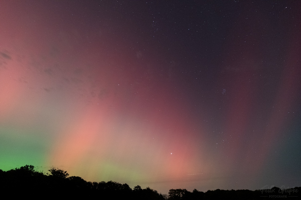Beobachtungsbericht: Ich habe mir diesmal einen etwas dunkleren Standort gesucht, der auch mehr freien Blick Richtung Osten hat. Das war im Nachhinein die beste Entscheidung. In der Dämmerung war erstmal noch nichts zu sehen, es zogen einzelne Wolken durch. Ab etwa 19:40 MESZ schaute der grüne Bogen über einer Wolkenbank im Norden heraus. Langsam gesellten sich violette Schimmer dazu. Alles nur fotografisch sichtbar. Gegen 20:00 MESZ gab ein kurze Aktivitätsphase mit einigen Beamern, diese kündigten einen ersten Substurm ab. Pünktlich dazu zog es fast komplett zu. In den Wolkenlücken war aber rot und Violett auf den Fotos zu erkennen. Ab 20:40 MESZ klarte es dann wieder auf. Der grüne Wahnsinn beginnt, ab jetzt war es auch schwach visuell zu erkennen. Begleitet wurde der grüne Wahnsinn durch einige rote Beamer. Um 21:00 MESZ wurde es dann erstmal wieder ruhig für etwa 30 Minuten. Dann gewann der grüne Bogen deutlich an Helligkeit und stieg in die Höhe. Großes Feuerwerk mit visuell deutlich sichtbaren Beamern ab 22:20 MESZ. Bis 23: 00 MESZ erfasste das Polarlicht den gesamten nördlichen Himmel von Ost über Nord bis West. War im Osten aber viel heller. Rote Beamer hell bis sehr hell visuell zu erkennen, auch die Bewegung war erkennbar. Das grüne Polarlicht war ebenfalls visuell hell erkennbar, blieb aber eher gräulich. Um die Zeitherum war auch der SAR-Bogen fotografisch nachzuweisen. Danach flaute die Aktivität wieder ab, fotografisch tanzten im Osten rote und grüne Polarlichter aber lange Zeit umher. Die Helligkeitswechsel des grünen Polarlichts waren schnell. Um 23:45 zog der Himmel dann leider sehr zügig zu, so dass ich den nächsten Substurm um 1:00 MESZ nicht beobachten konnte.