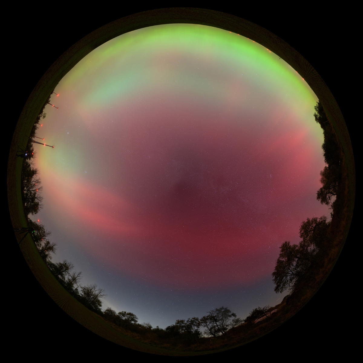 3. Substorm 22:40 - 23:40 : Der Substorm begann abermals mit einer sehr strukturierten Unterkande des grünen Polarlichtbandes, sowie extrem dynamischen Bewegungen darin. Der Schattenwurf war etwas schwächer als beim 2. Substurm. Aus dem grüne Band ging dann immer mehr helle rote Strahlen hervor, die weit über den Zenit reichten. Starke, extrem Helle, aber strukturarme rote Corona im Zenit. Ab etwa 23:20 UTC praktisch eine all-red Aurora fast ohne grüne Anteile vor allem im westlichen Teil des Himmels.