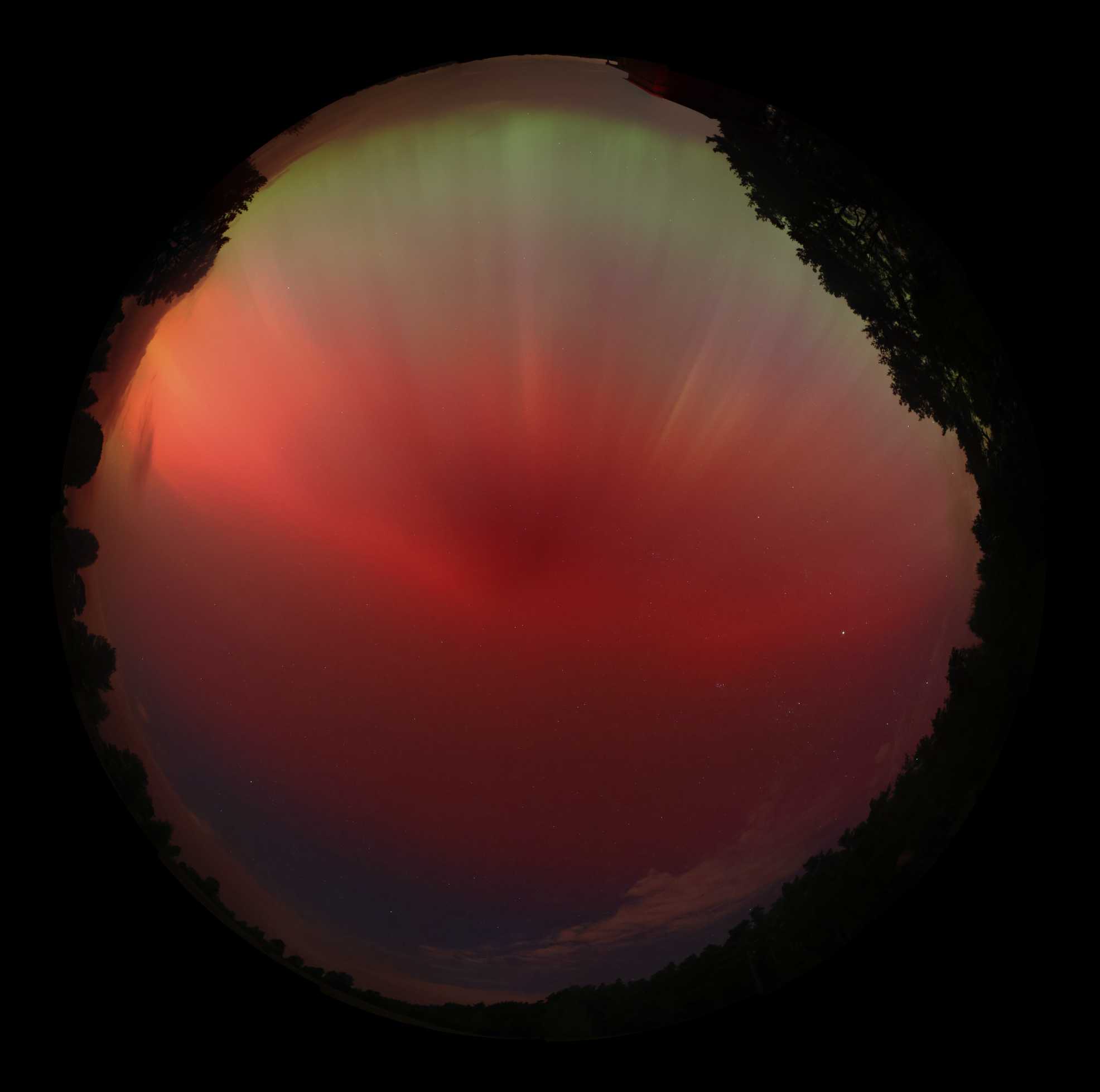 Ab ca. 24 Uhr mit dem Auge überall eher schwaches rotes Licht sichtbar - und der konstante Hauptbogen im Norden, der fürs Auge eher weiß aussah. Es gab bis 3 Uhr immer mal wieder sehr kräftige kürzere Phasen, teils mit riesigen Vorhängen.