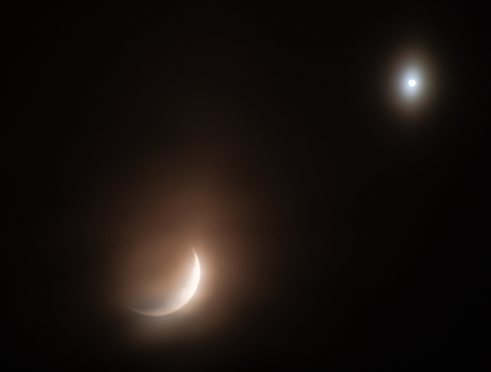 es freut mich sehr, von euren positiven (insbesonders den freisichtigen) Venus-Beobachtungen zu hören! Danke für eure Mitteilungen. Nach der Beobachtung gestern Mittag zog sich der Himmel zu: ich hatte keine weitere Beobachtungsgelegenheit. Ich hatte aber einige Bilder gemacht – allerdings hatte ich noch eine sehr Hohe ISO eingestellt, die den Mond sehr verrauscht (verschwommen) darstellt, ebenso den Himmelshintergrund. Ich befürchtete, dass Venus daher gar nicht abgebildet sein würde – aber sie ist auf jeder Aufnahme eindeutig als heller Punkt zu erkennen. Holt also eine hohe ISO Gestirne am hellen Tageshimmel besser hervor als geringere Auflösungen? Das wäre ein interessanter Punkt.
