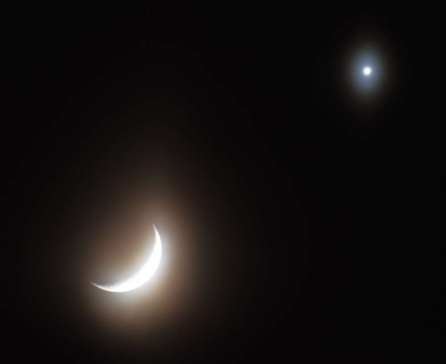 Der Mond ist (12:30 MEZ) inzwischen problemlos aufzufinden, die etwa 3.5° links oberhalb stehende Venus zwar gut sichtbar, aber sowohl schwer auf- als auch dann wiederzufinden. Daten nach stellarium: