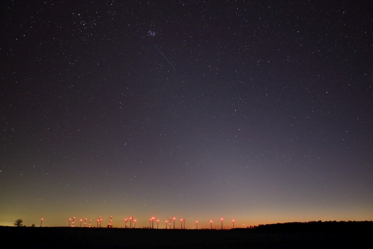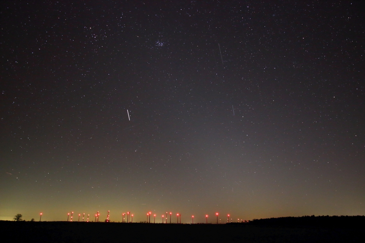 Nachdem ich das Zodiakallicht bereits am Vorabend im Fläming in Augenschein nehmen (und fotografisch nachweisen) konnte, machte ich mich gestern Nachmittag auf dem Weg in die Altmark, wo die Lichtverschmutzung nochmal deutlich geringer ist und deshalb zusammen mit dem Wendland in Niedersachsen in Zukunft wohl auch ein zusammenhängender Sternenpark entstehen könnte. Für mein Vorhaben wählte ich einen vom Bahnhof fußläufig schnell erreichbaren Platz mit akzeptablen Bedingungen gen Westen und guten gen Norden, weil ich insgeheim auch mit Polarlicht rechnete. Die Unwägbarkeit, dass auf dem vor mir liegenden, großen Acker bis nach Sonnenuntergang reichlich gedüngt wurde, was für die Luftfeuchtigkeit bodenah bei ohnehin schon nahezu windstillen Bedingungen nicht gerade förderlich war, musste ich dann in Kauf nehmen. Nichtsdestotrotz gelang es das Zodiakallicht mit einfachen Mitteln, wer benutzt heute schon noch eine 13 Jahre alte APS-C-Kamera, nachzuweisen. Vielleicht motiviert es auch ja den ein oder anderen weit abseits der Städte, heute oder die kommenden Tage auch mal einen visuellen oder fotografischen Versuch zu starten. Auf der gezeigten Aufnahme wird das Zodiakallicht von der mittlerweile fast unvermeidbaren Starlink-Armada rechts und der ISS links flankiert.