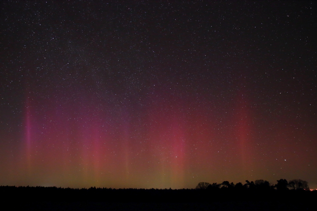 Nachdem ich bei vielen der vorangegangenen Events zwar dabei, aber lange nichs mehr hochgeladen hatte, hier nun auch mal wieder einige Aufnahmen von mir. Der Substorm kam in dieser Intensität trotz des Wissens um den Russell-McPherron Effekt / die (Nähe zur) Tag- und Nachtgleiche auch für mich unverhofft. Damit hätte ich angesichts der Werte am DSCOVR so eher am Vorabend gerechnet. Auch ging ich wie Henning ebenfalls aus, dass es nicht bei diesem einen Substorm bleiben würde. Das deutlich visuelle Polarlicht beobachtete ich bei hervorragender Transparenz aus der Altmark heraus, nachdem ich abernals das meinem Empfinden nach im Vergleich zum Vortag weniger stark ausgeprägte Zodiakallicht in Augeschein genommen hatte. Strahlen(gänge) & das rot des Polarlichts waren mit bloßem Auge sehr gut zu erkennen. Darüber hinaus zeigten sich abseits der Strahlen für kurze Zeit auch 2x pulsierende, farblos, diffuse, kreisförmige Regionen, die von der Kamera im Intervallmodus leider nicht eingefangen wurden, möglicherweise den Belichtungspausen geschuldet. Fotografisch nachweisbar war das Polarlicht mit grünem Bogen, roten Flächen und rot-violetten Strahlen(bündeln) von 21:03 - 21:47 MEZ.