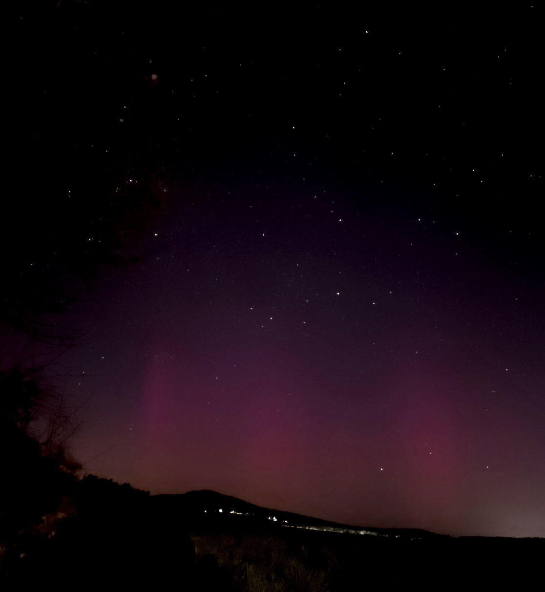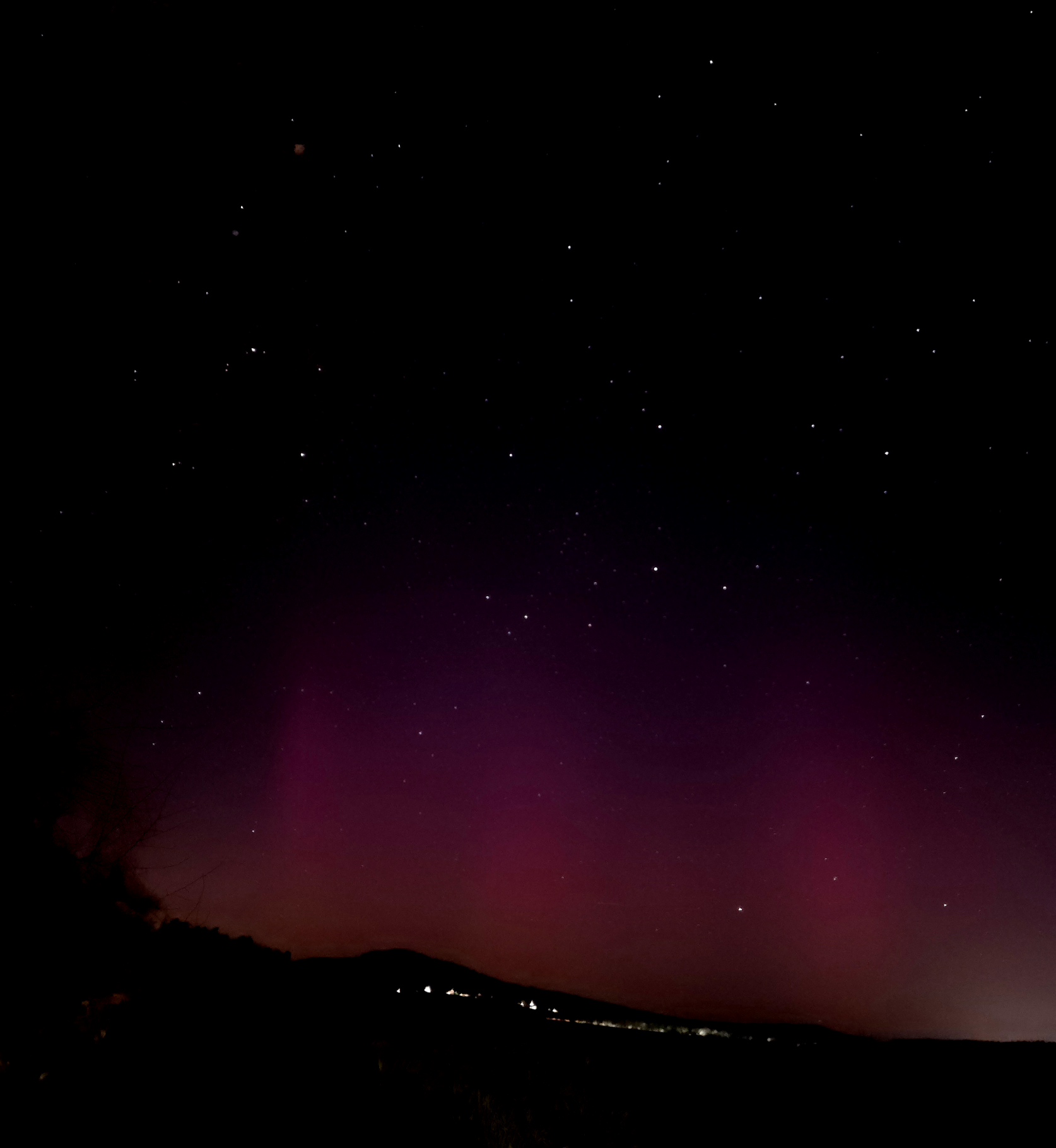 konnte ebenfalls das Polarlicht fotografisch einfangen. Anfangs aus der Haustür schöne violette Strahlen und 12 Minuten später am Beobachtungsplatz leider bereits etwas schwächer mit grünem Bogen und rot/violette Flächen.
