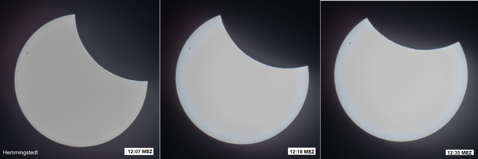 Wähgrend der gesammten SoFi war der Himmel hier bedeckt, nur um etwa 30 Minuten nach deren Ende rasch weitgehend aufzuklaren.