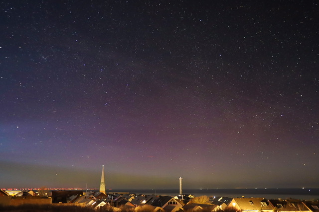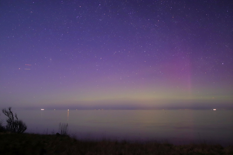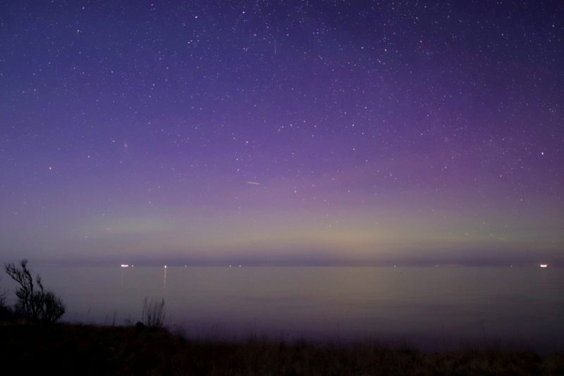 In der Eckernförder Bucht seit ca. 1h auch Polarlicht. Nur fotografisch, grüner Bogen.