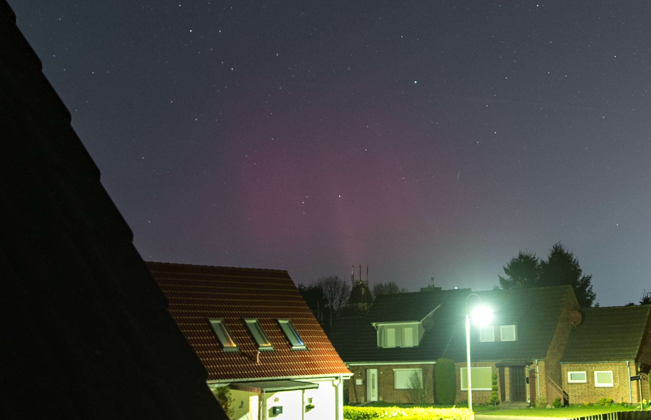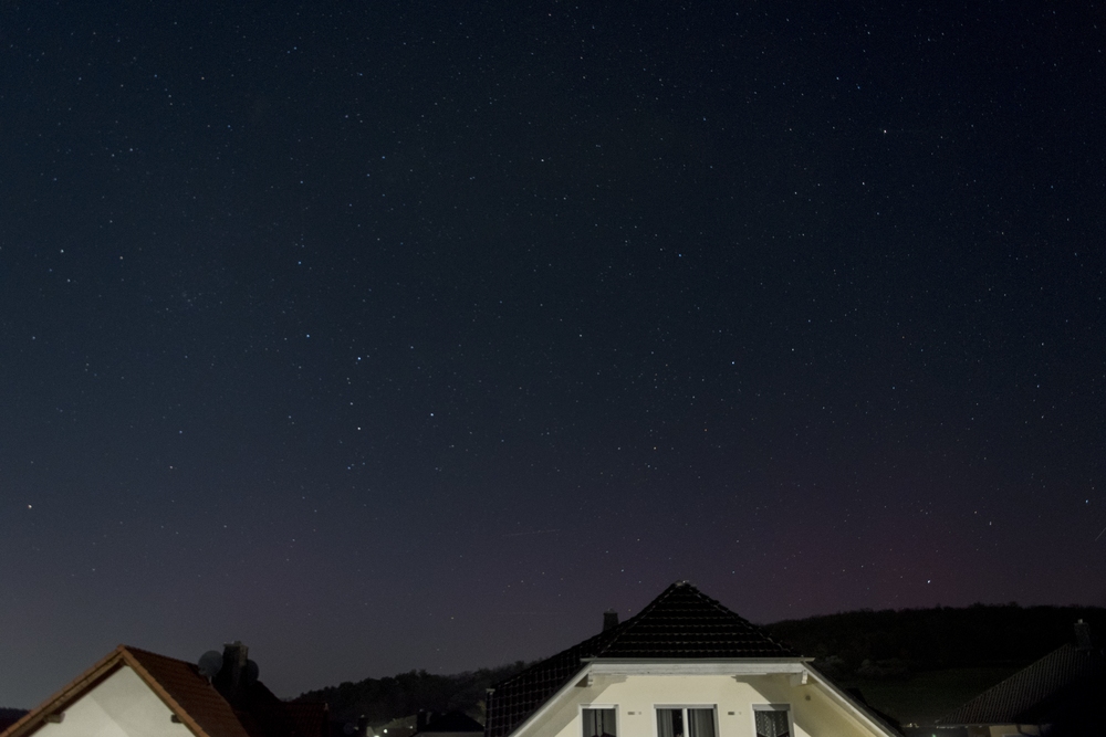 Hamburg-Rahlstedt fotografisches Polarlicht seit 23:20 MESZ. Roter Strahlenvorhang und grüner Bogen.