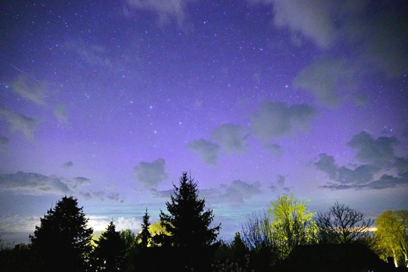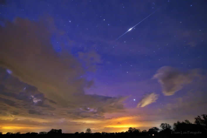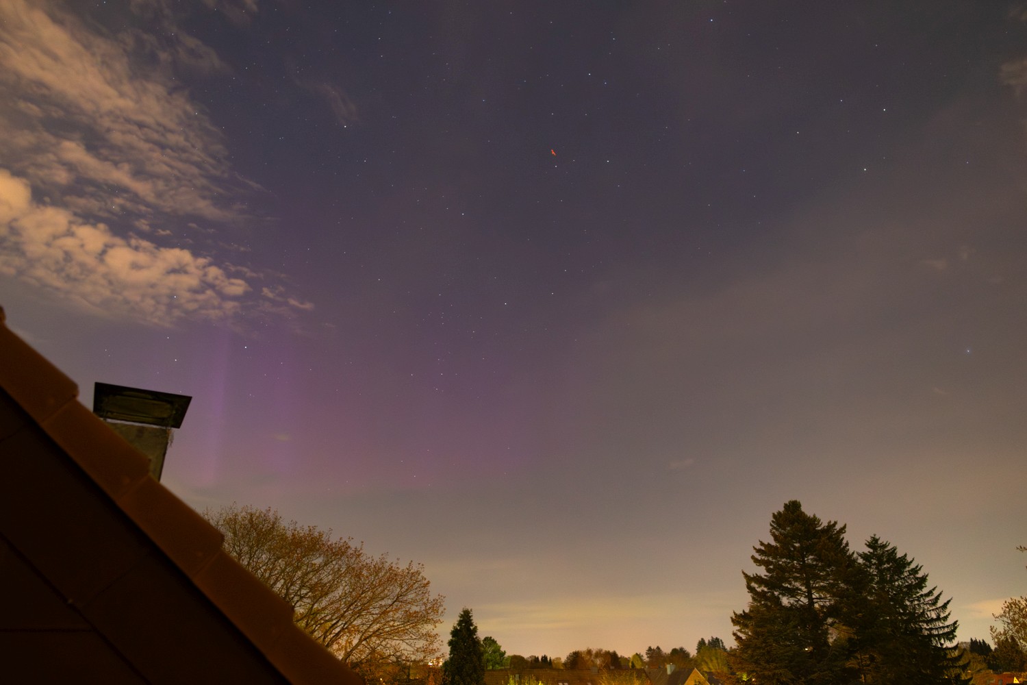 Ab 22 Uhr war der Himmel bereits in den Wolkenlücken lila eingefärbt. Bild 2 (da hab ich wohl auch einen Satelliten-Flare erwischt)