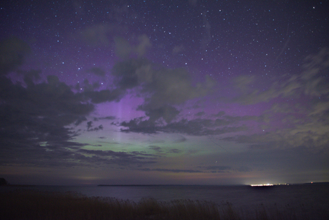 Es gab erfreulicher Weise trotz Schleierwolken und kompakter größerer Wolken doch einige Wolkenlücken. Zunächst zeigte das Kameradisplay nur einen "lila Schein" am Himmel ohne erkennbare Strukturen. Etwas später war zusätzlich trotz der Wolken etwas vom grünen Bogen zu erkennen, so dass ich zum See gegangen bin. Ganz vergebens war es zumindest nicht.